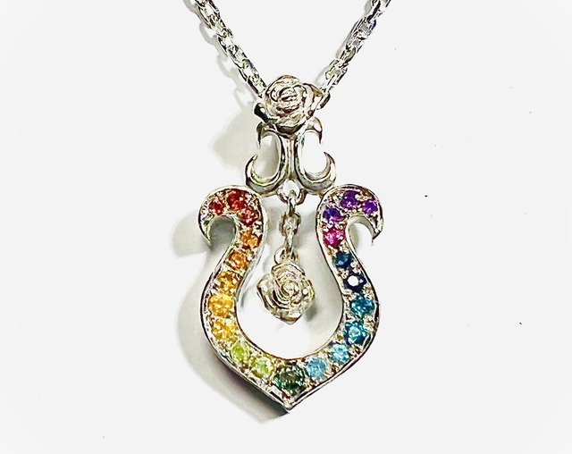 昔から幸運をため込むラッキーアイテムとして認知されている、馬蹄(ホースシュー)をメインに、 薔薇が中央で揺れるようにぶら下げたペンダント。 ちょっとした動きに薔薇が反応して、存在感を出しています☆ 通常品はキュービックジルコニアのみの石使いですが、、 こちらは多種多様な天然石(下記参照)を虹色のグラデーションで表現した、特別限定品になります!! 高級石のアレキサンドライトも使用! (※アレキサンドライトの色見はその都度違います) 特別品の高級感を味わってください! 商品詳細 素材、、、シルバー925(変色防止のロジウムコーティング済み) 寸法、、、縦(約30mm) 横(約16mm) 厚さ(約6mm) 石、、、ガーネット、マンダリンガーネット、シトリン、ペリドット、アレキサンドライト、スイスブルートパーズ、ロンドンブルートパーズ、サファイア、ロードライトガーネット、アメシスト 馬蹄の中央がアレキサンドライトになります。 今ならシルバー925薔薇のチャーム付きチェーン プレゼント!! こちらは工程が多いので2週間前後の製作期間をご了承下さいませ^_^