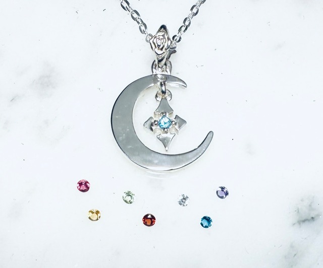 大人気のPure Crossを三日月の中央1箇所にフリフリさせたいシンプルかつ遊び心のあるペンダントです。 BLUE ROSEらしい小さい薔薇のバチカンもワンポイント♫ 瀧田さん本人の「三日月にクロスを揺らしたい!」 という想いから生まれました☆ こちらは、Special versionで 三日月部分に10石の石を入れて 10周年をお祝い♪(*^^)o∀*∀o(^^*)♪ よりキラキラと特別感がUPした作品になります☆ クロスの中央の石は選べますので個性を出せますよ ᕦ(ò_óˇ)ᕤ 石を下記から選んで、ご購入の際に備考欄にご記入下さいm(_ _)m 1月 ガーネット 赤 2月 アメジスト 紫 3月 アクアマリン 薄い水色 4月 キュービックジルコニア(人工ダイヤモンド)透明 5月 エメラルド(合成)緑 6月 ブルームーンストーン 乳白色 7月 ルビー(合成)赤ピンク 8月 ペリドット 黄緑 9月 サファイヤ(合成)青 10月 ピンクトルマリン ピンク 11月 シトリンかブルートパーズ 黄か水色 12月 タンザナイト 薄紫 ☆他の石が良い方は、お気軽にお問い合わせ下さい☆ *別料金になりますが、ペンダント部分を イエロー、ピンク、ブラックのコーティングも出来ますので、その際はカテゴリーのカスタムから2000円を同時購入して頂き、種類を備考欄にご記入下さいm(_ _)m *受注生産になりますので、2週間前後の製作期間をご了承下さいませm(_ _)m 素材 シルバー925 幅:縦 約 18mm 横 約 14mm 厚:約 1.3 mm 石、、、クロス中央 各種 三日月、、10石キュービックジルコニア チェーン、、、細身のシルバー925 45cm