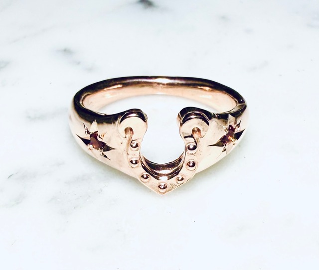 幸運を貯め込むラッキーアイテムとして有名な 馬蹄(ホースシュー)をメインに サイドには、石を縁起が良い後光留めでセットしています☆ Fortune「運」を身に付けましょう♪ 今回は、石をガーネットにして更にピンクゴールドコーティングを施して、気品を+しました^_^˚✧₊⁎ サイズは、9号です☆ シンデレラの様にサイズピッタリでデザイン気に入った方は、1点限りの特価品なので是非! また素材自体を10金や18金のイエローやピンク、プラチナ等に変える事も出来ますので、見積もりはお問い合わせ下さいm(_ _)m 商品詳細 素材 シルバー925 ピンクゴールドコーティング リングの幅 約2〜9mm リングの厚 約1.8〜3mm 使用石、、、ガーネット ※こちらの商品は、ショールーム在庫なので3日前後で発送しますᕦ(ò_óˇ)ᕤ