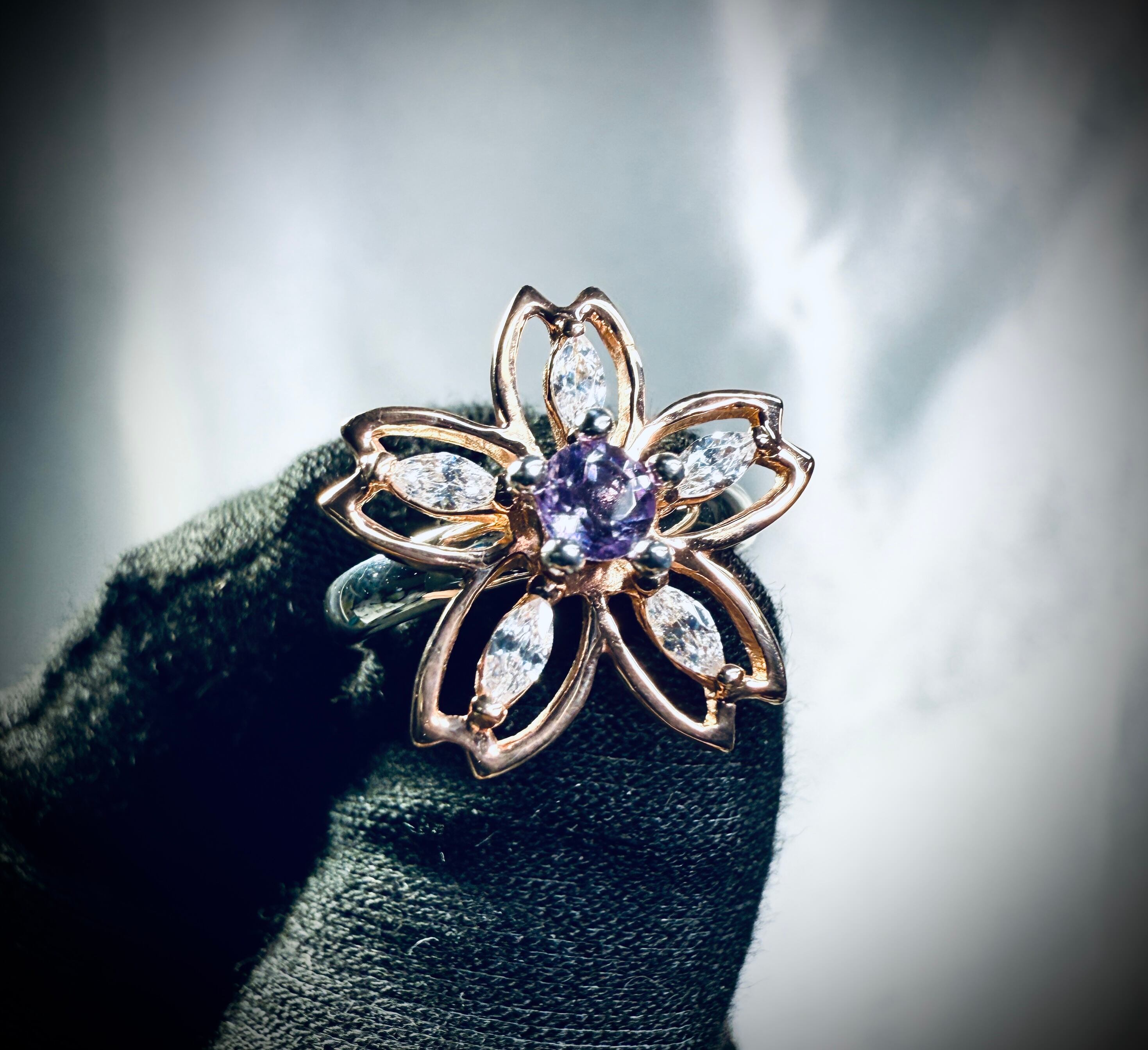 石がローズアメシスト(薄紫ピンク色)で花弁がピンクゴールドバージョンで9号をご用意☆