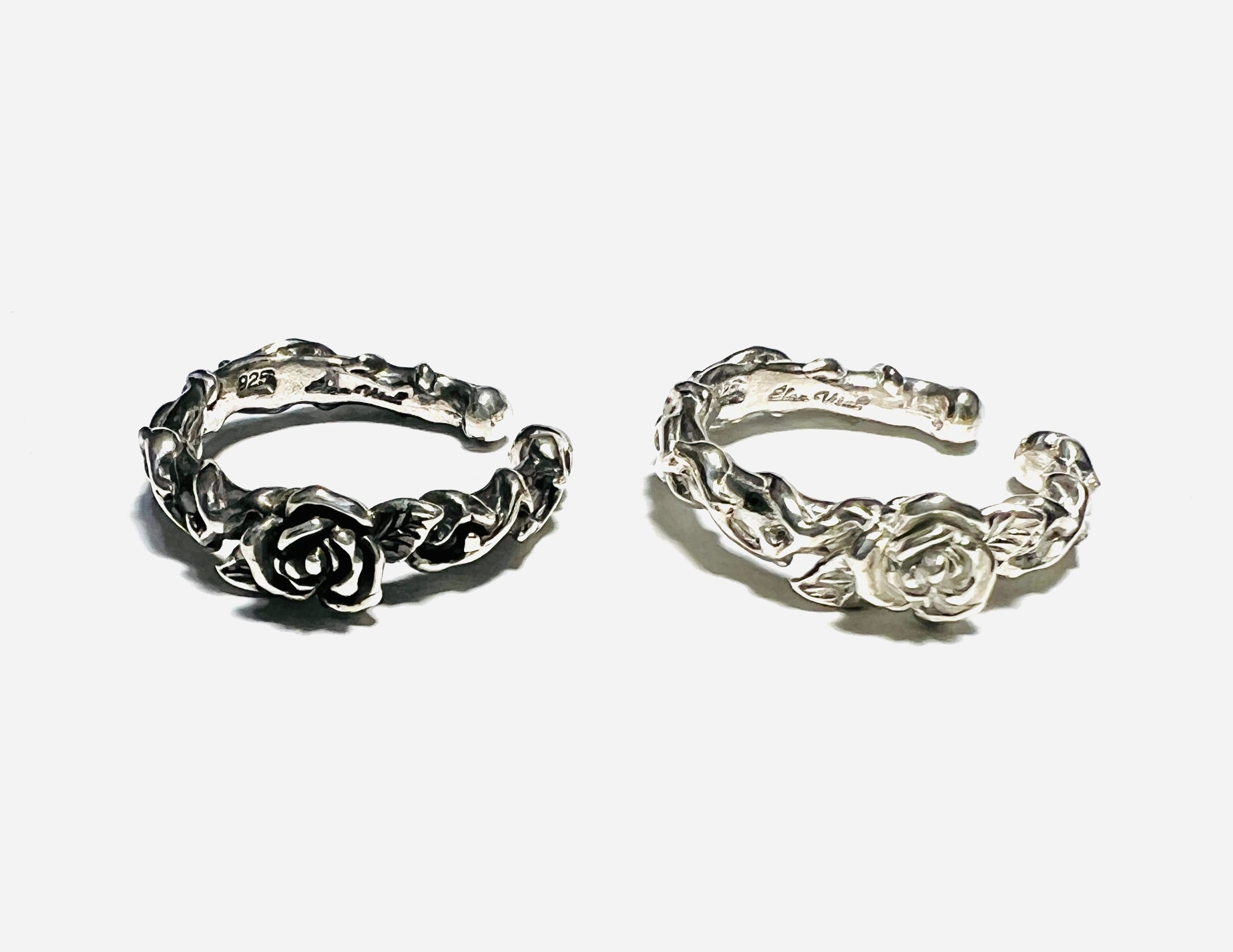 薔薇のツタをプレーンなリングに立体的に絡み付けたデザインで表現して耳に引っ掛けるタイプのイヤーフープ