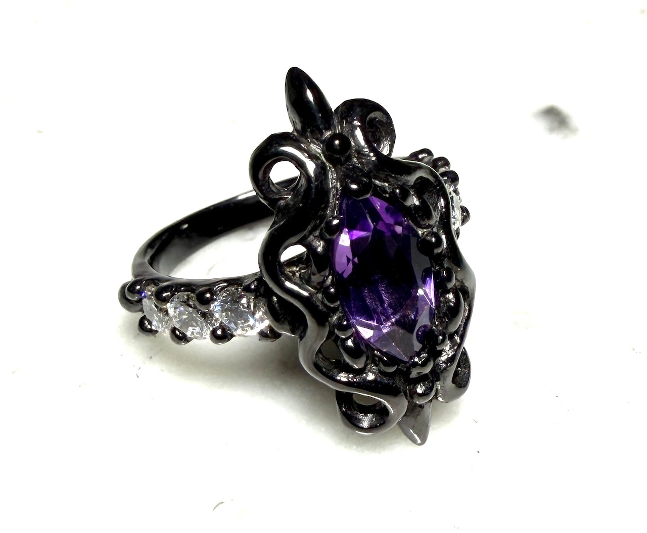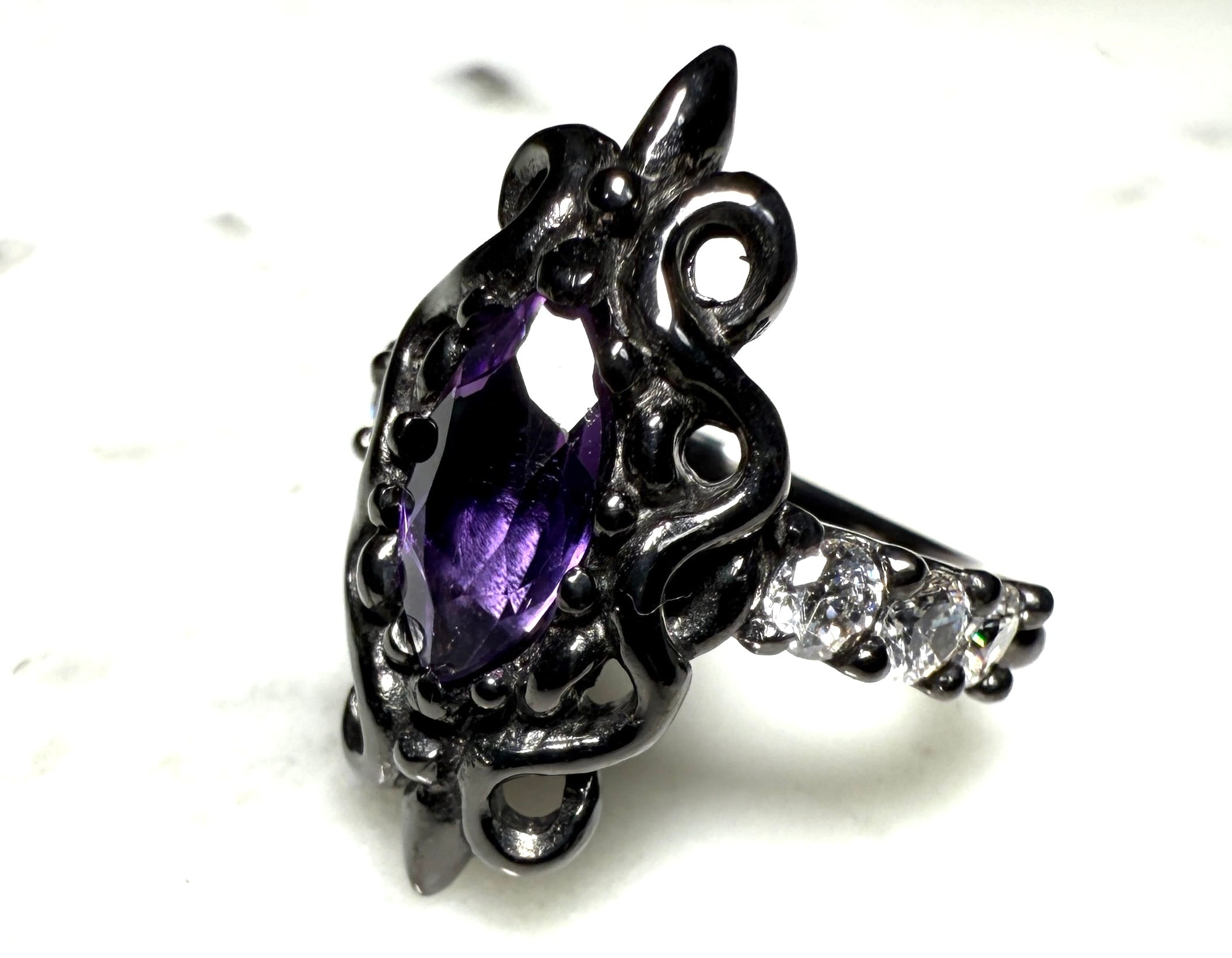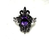 ユリと8の字に立体的に交差したツタで構成されたデザインに、大きめのマーキースカットのアメシストを中央にセット!!