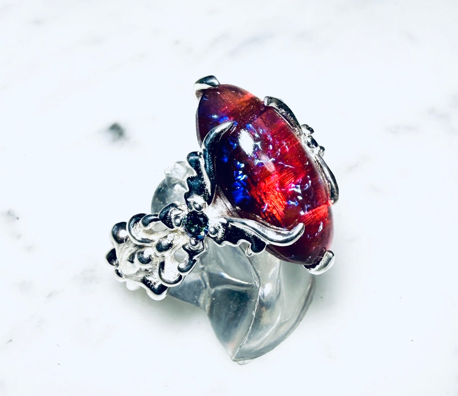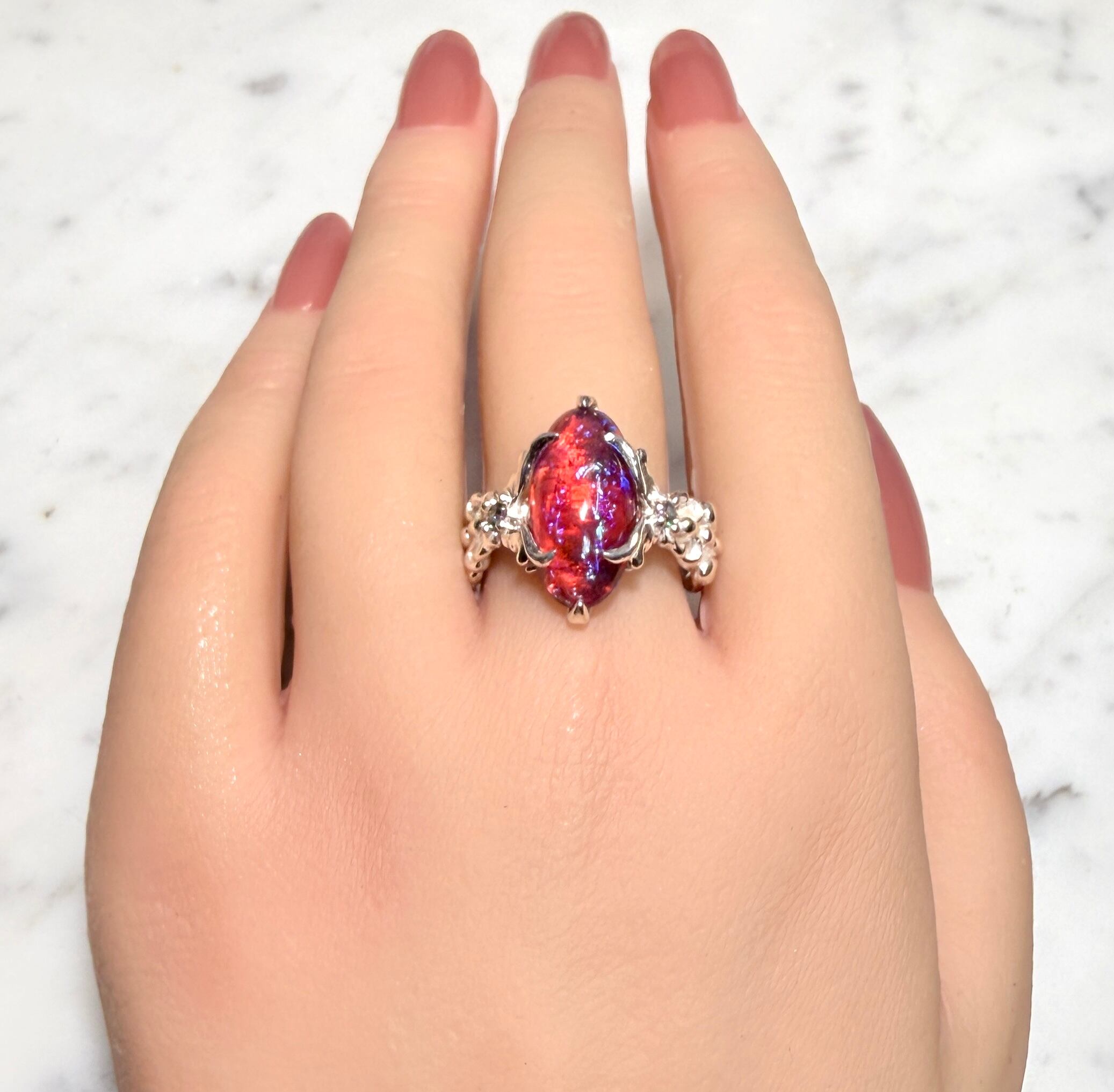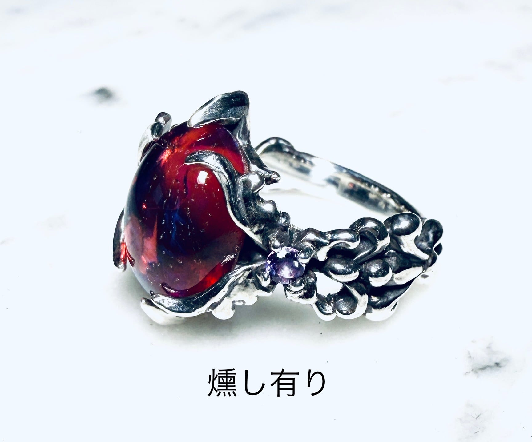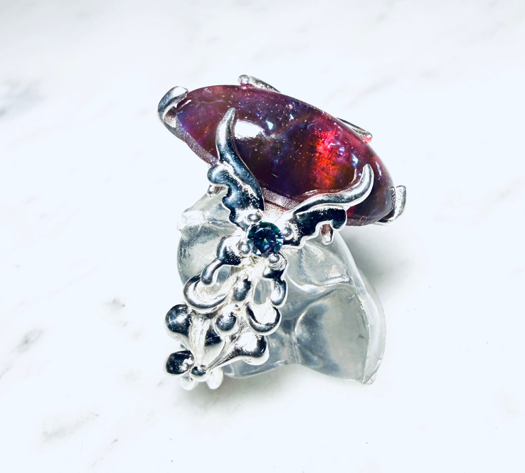 左右から燃え上がる様な蝶のデザインで石を固定しましたᕦ(ò_óˇ)ᕤ
