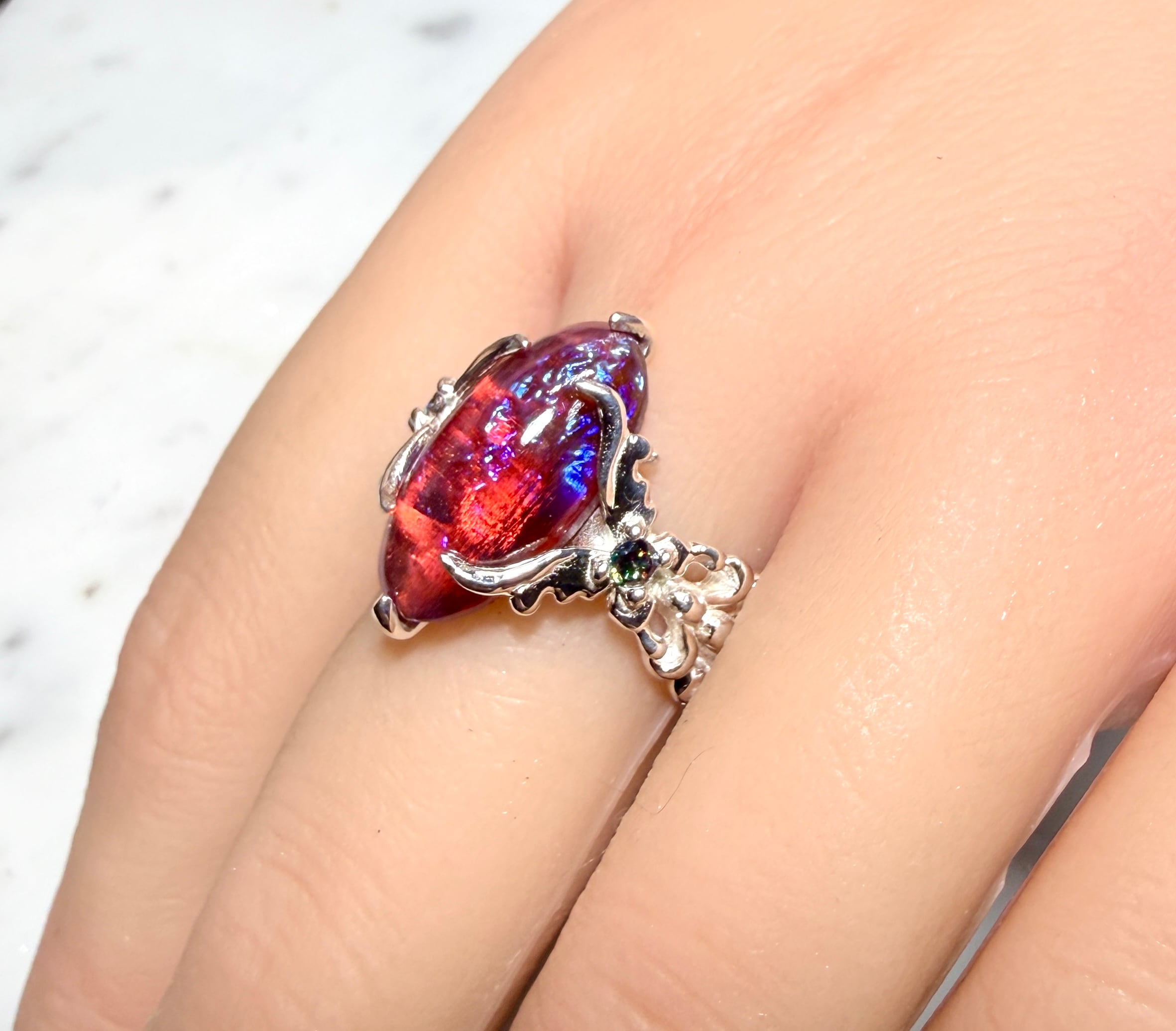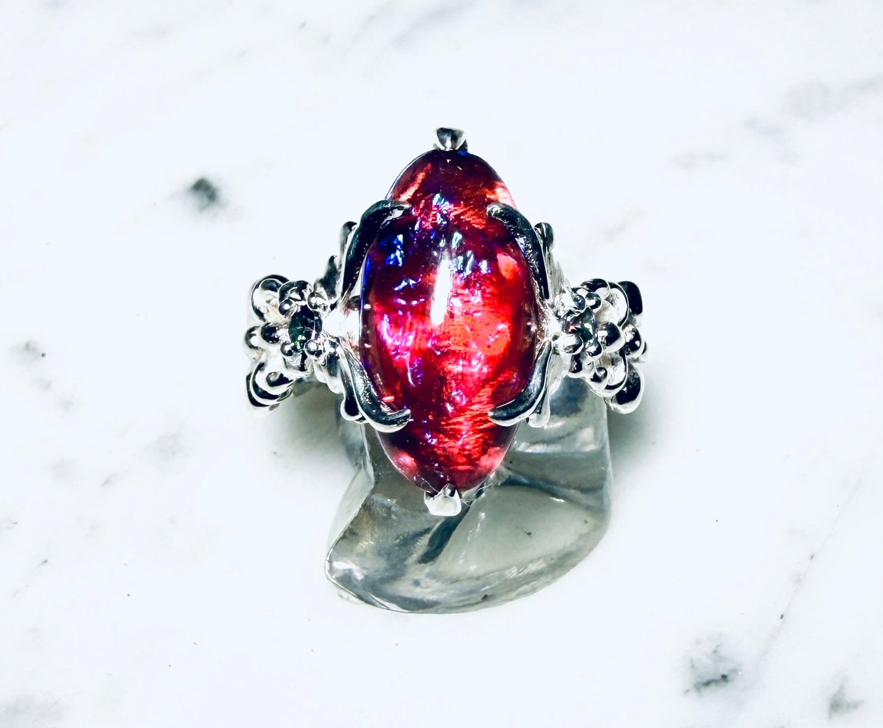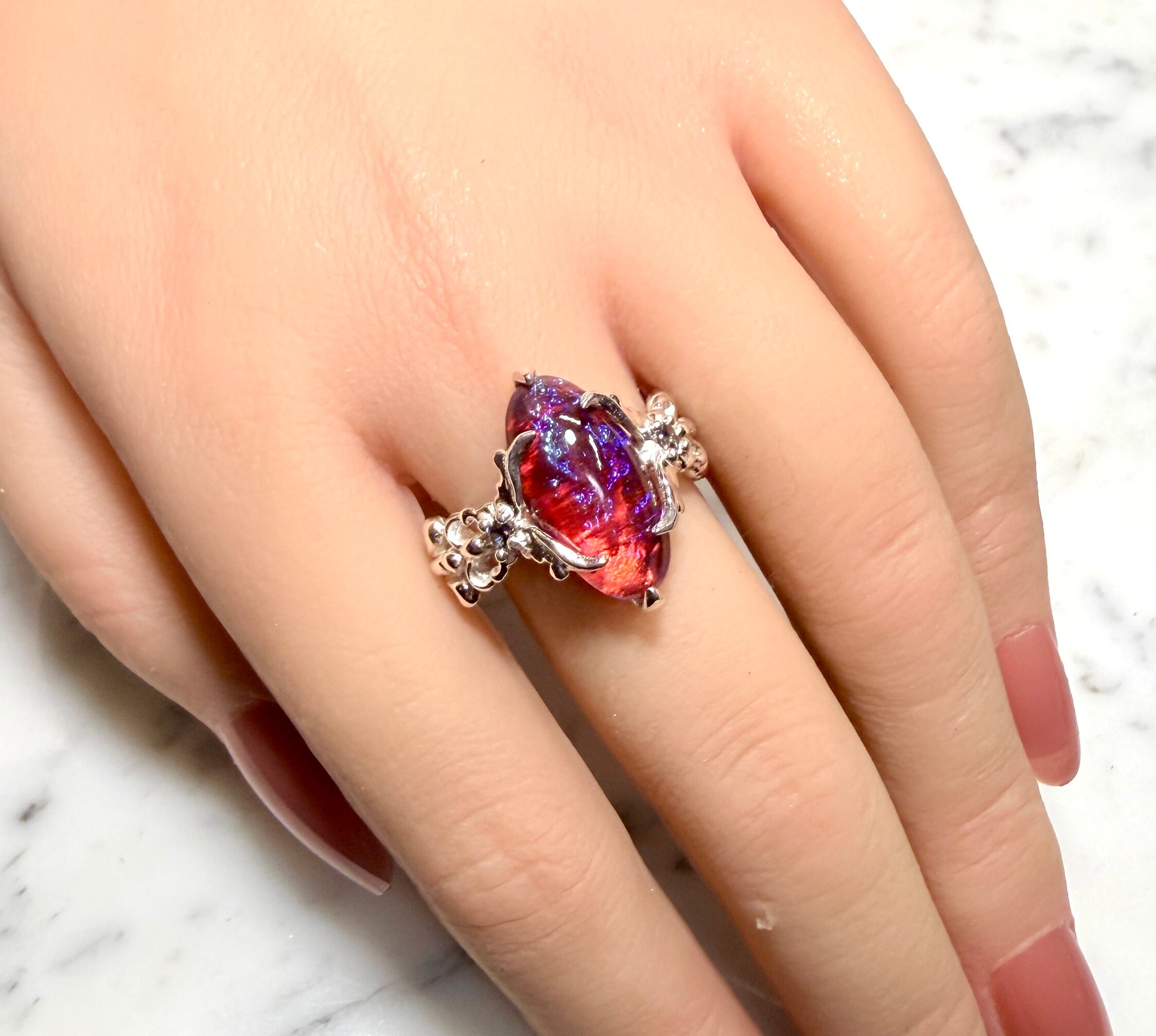 左右から燃え上がる様な蝶のデザインで石を固定しましたᕦ(ò_óˇ)ᕤ