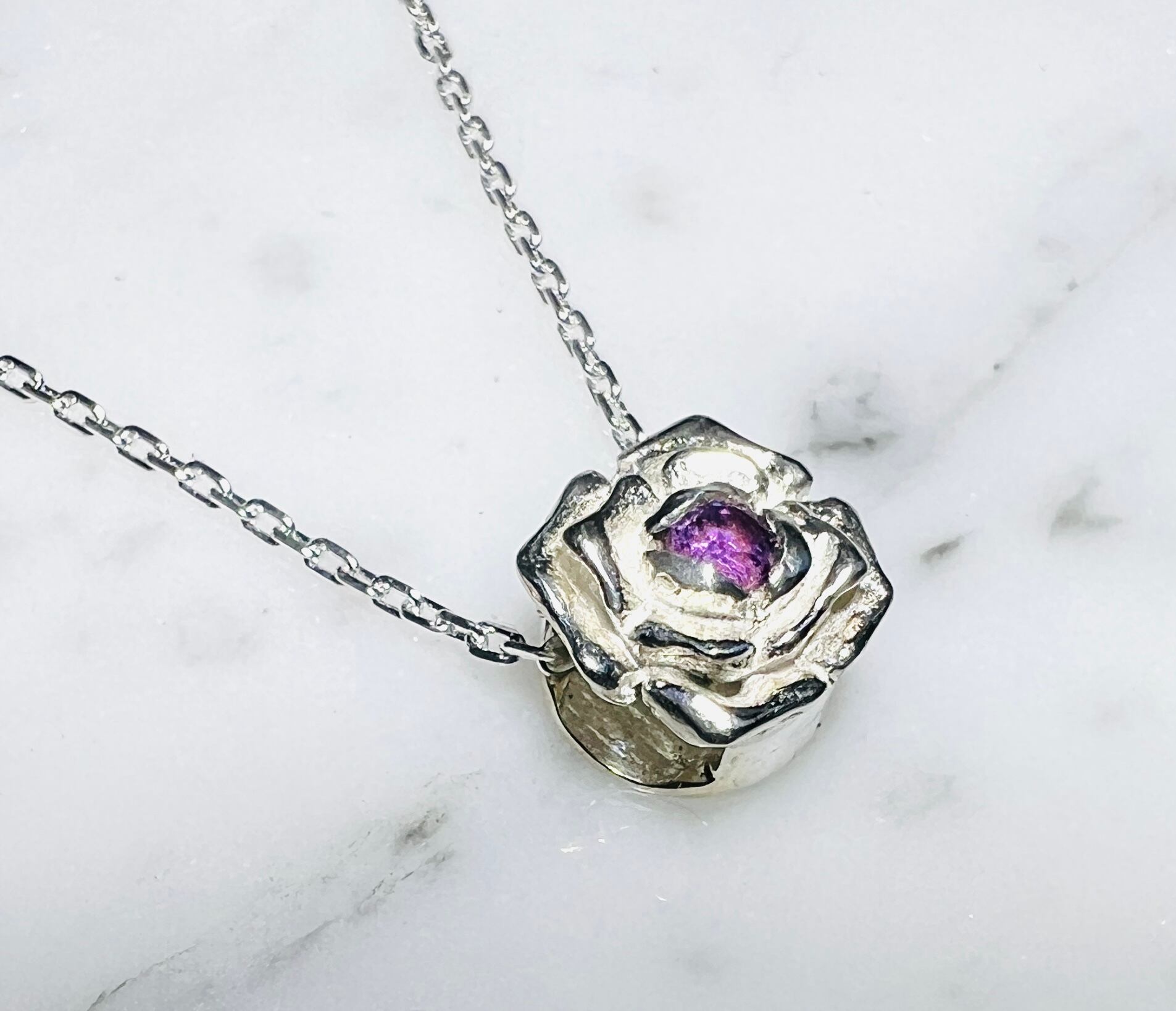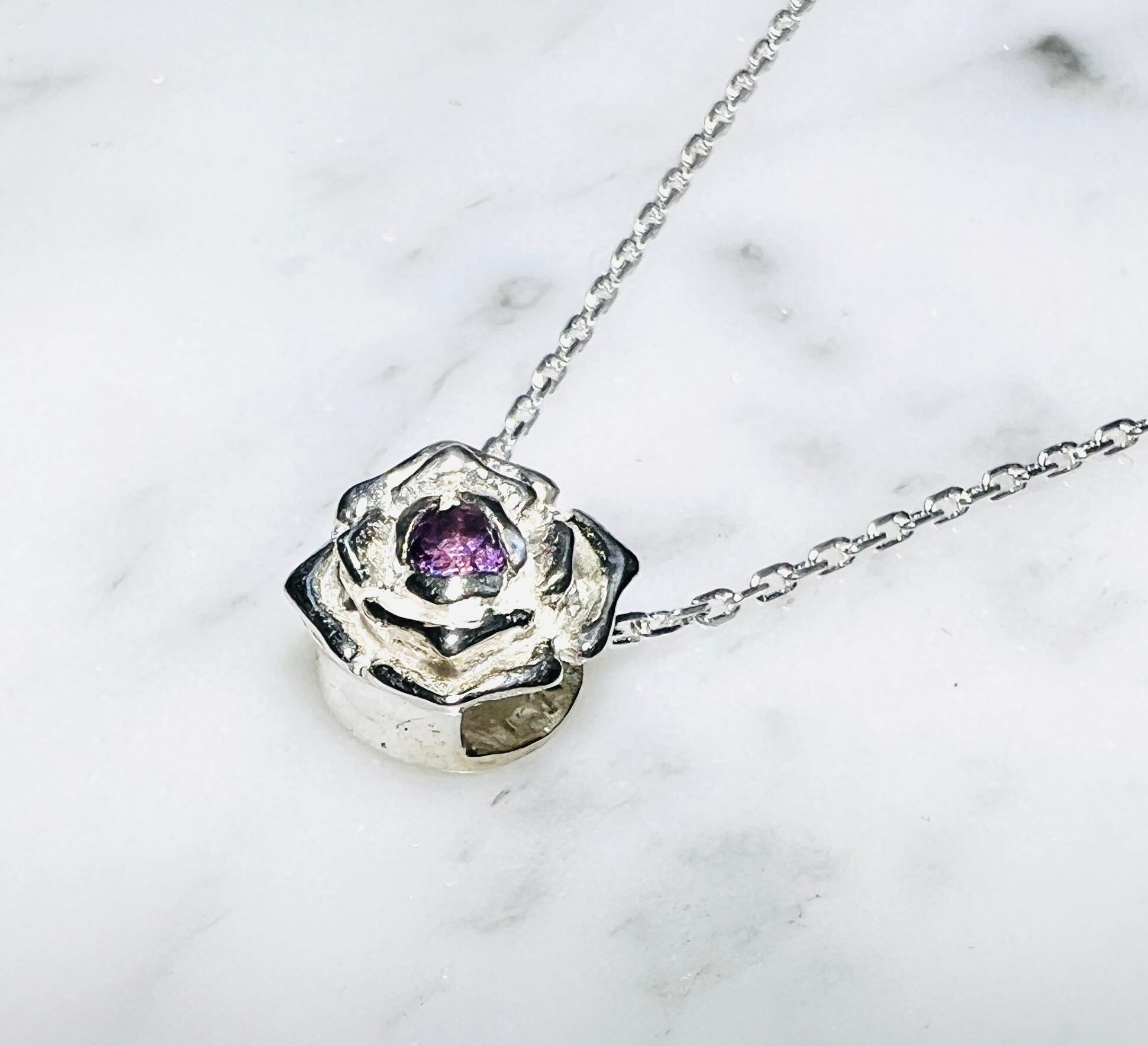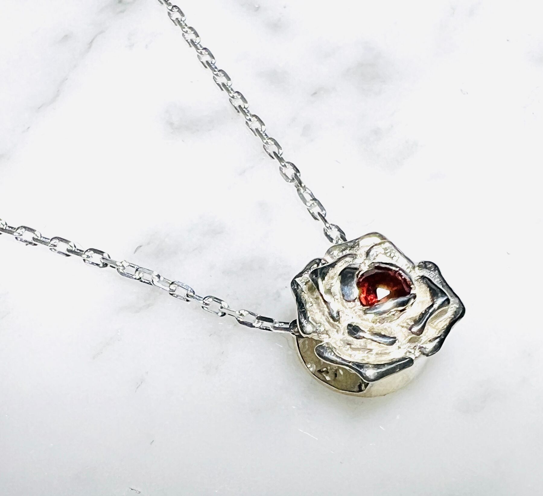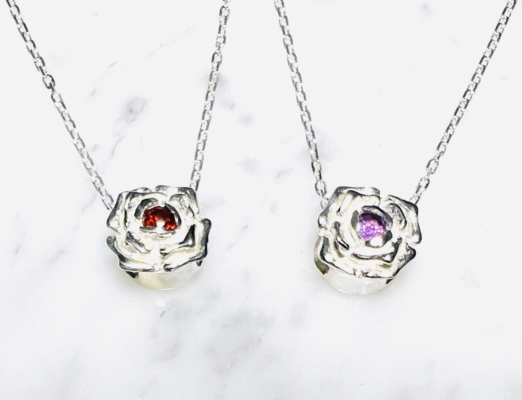 今回は、薔薇の中央に、ガーネットとアメシストを