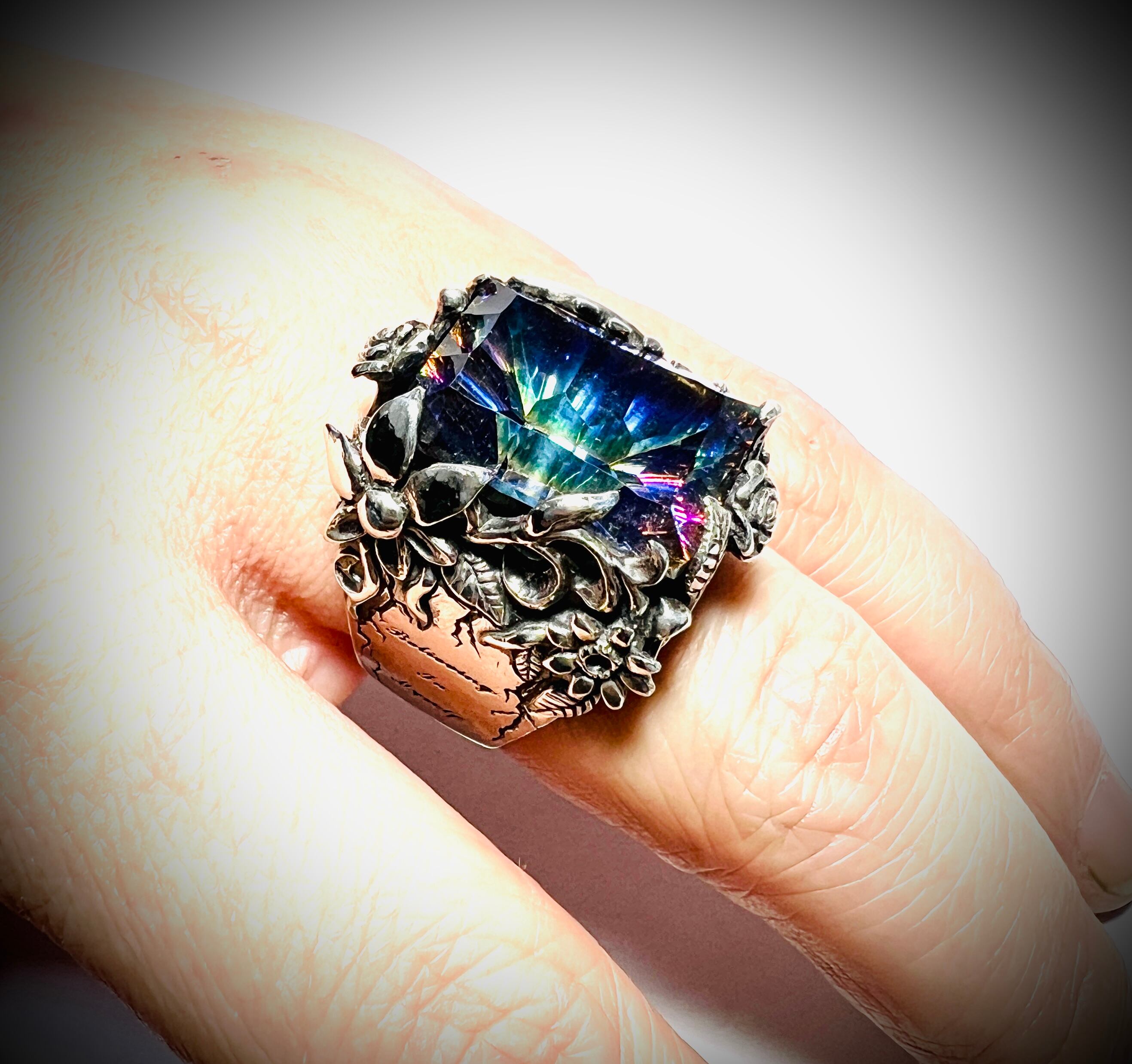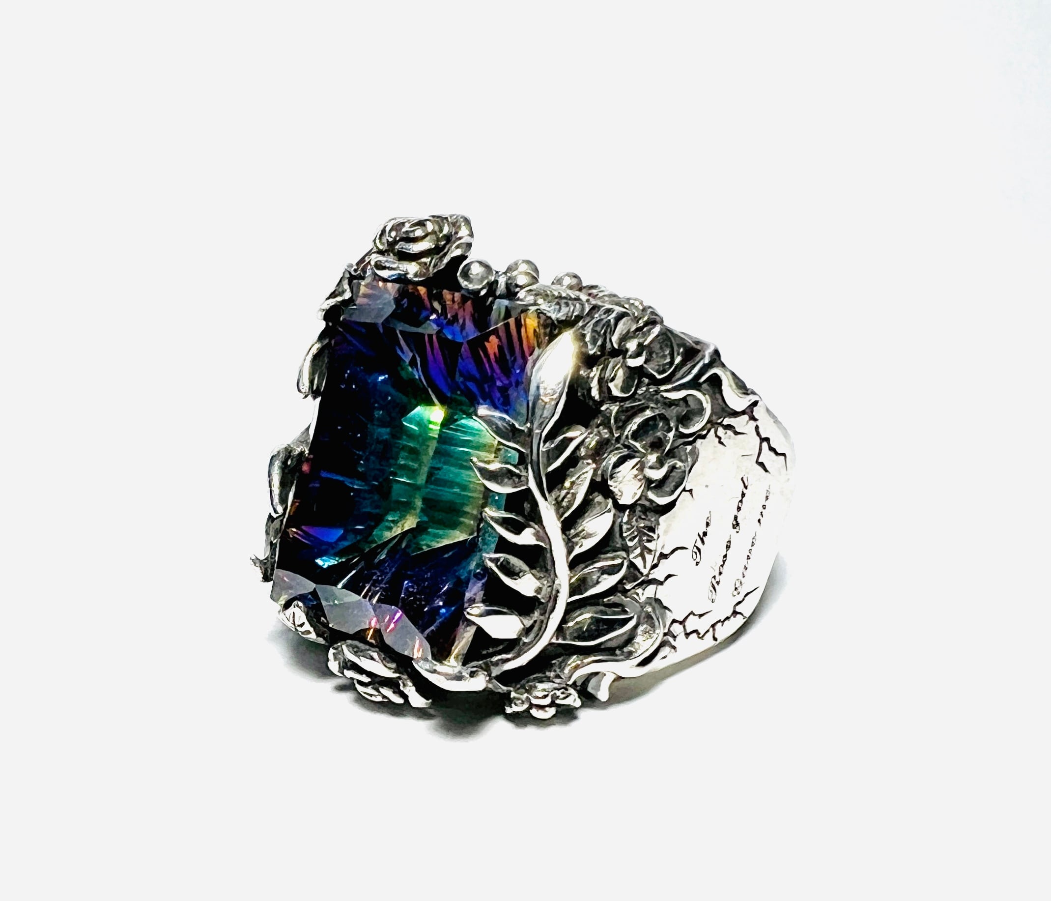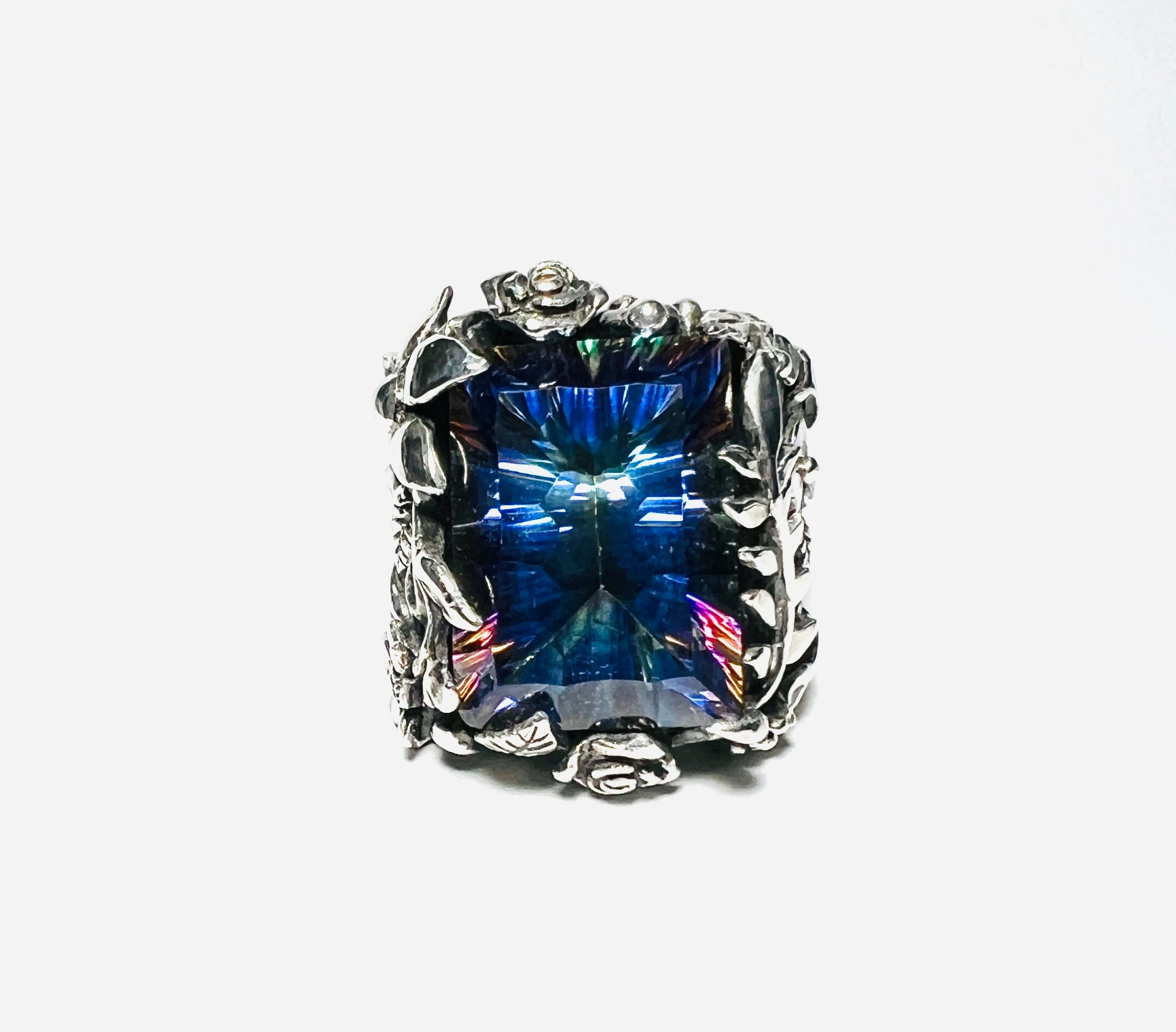 中央には、虹色に怪しく輝く大振りなミスティックトパーズをセットして、神々しさを出しました。
