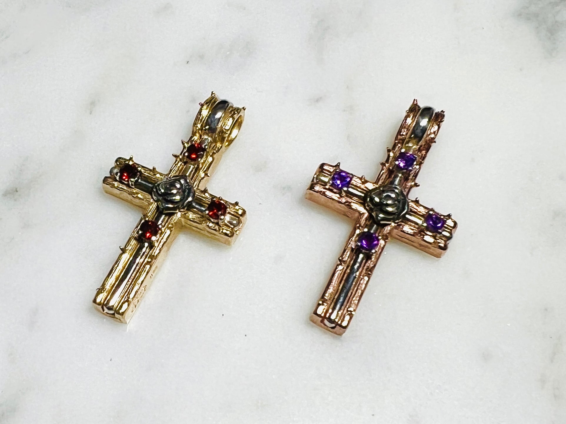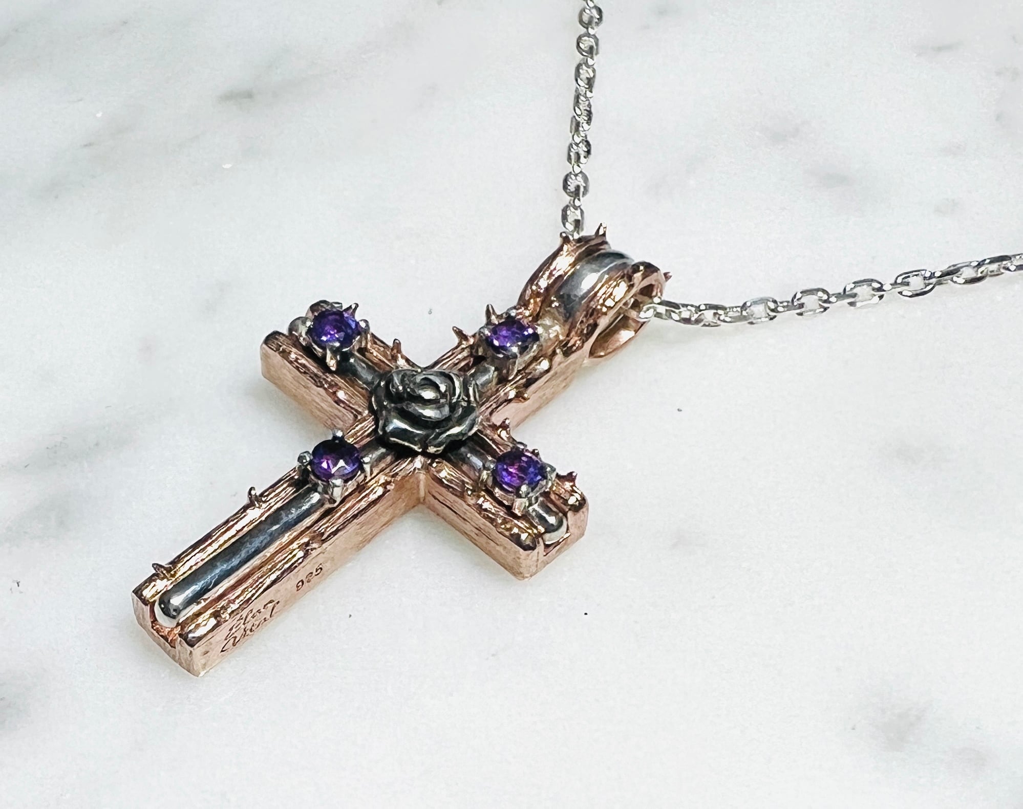 中央に薔薇、その周りに石、その周りがツタのクロスになっている、セパレートタイプの3ウェイペンダント。