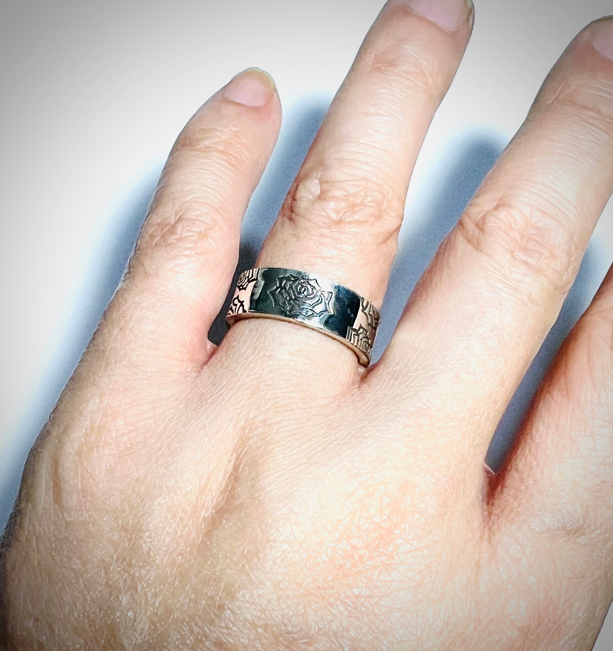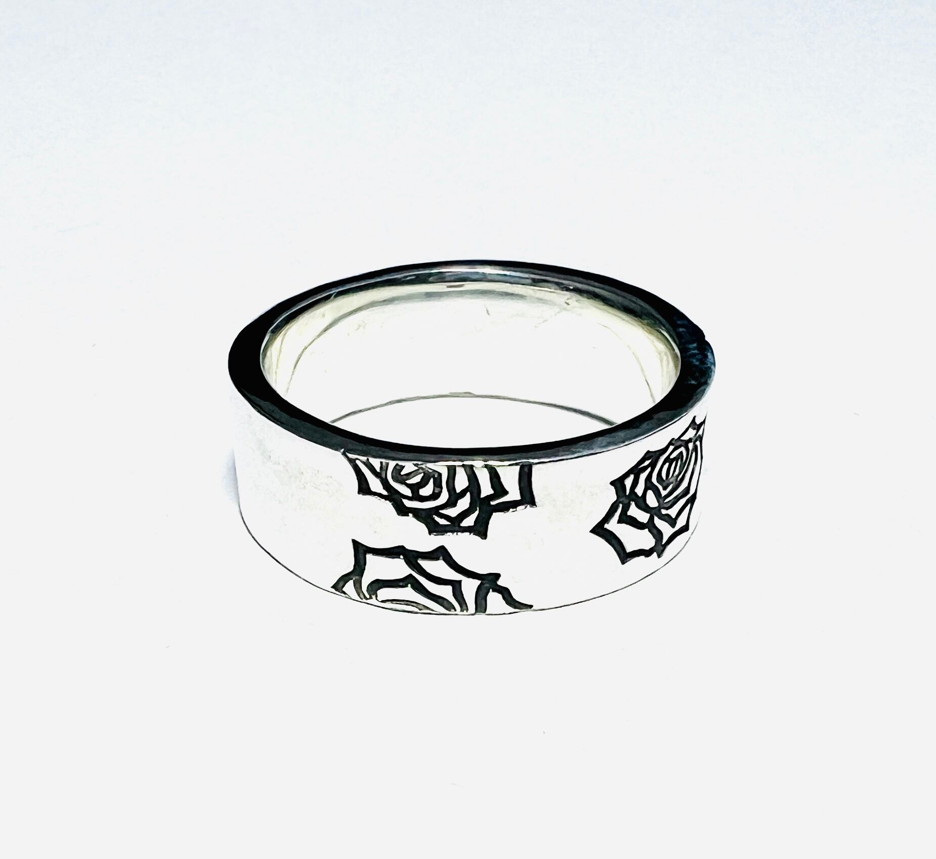 中央に薔薇の花とサイドの上下に半分ずつ薔薇を彫り込んだ、デザインリングになります^ - ^