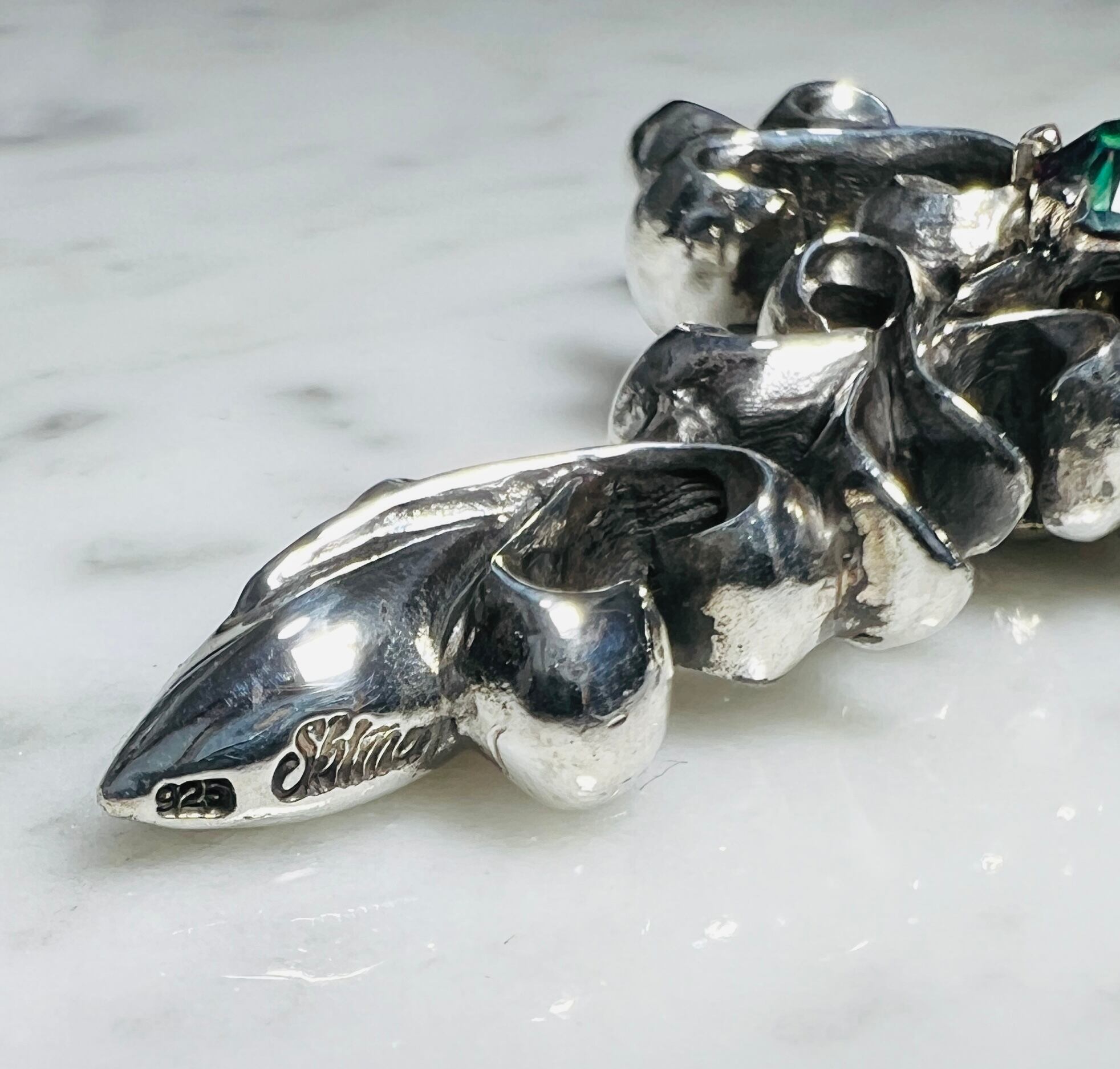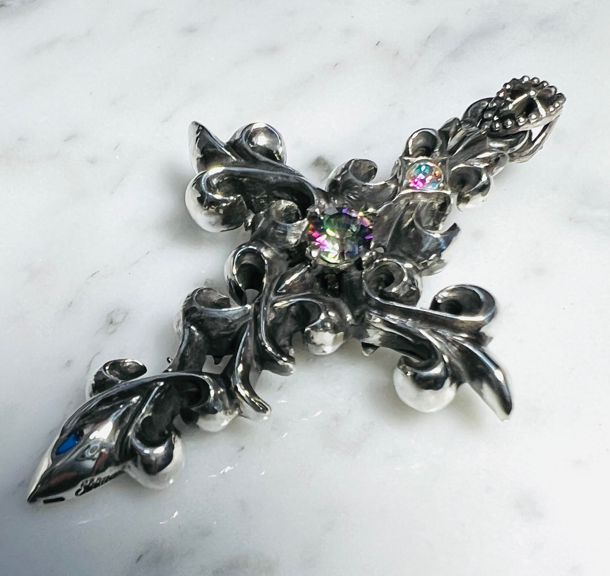 クロスの先端の返しが、8の字になる様に躍動感あるデザインにして、片面は中央にミスティッククォーツをセットし、上部にはオーロラ加工のプレシオサをセット。