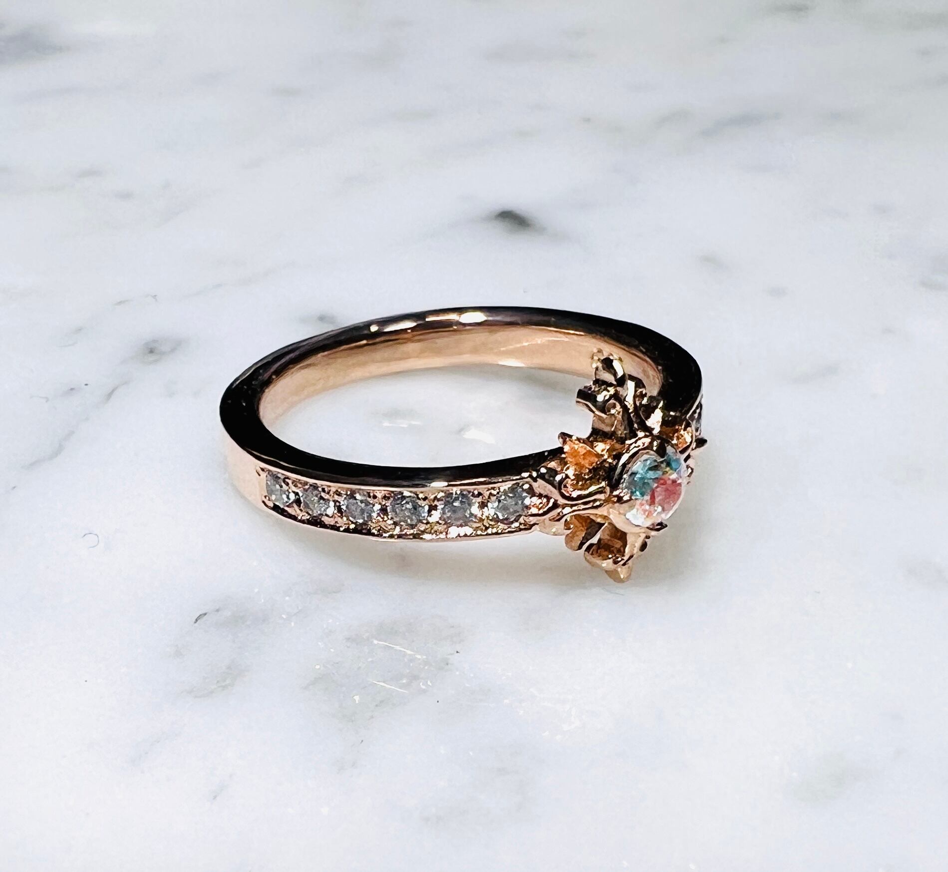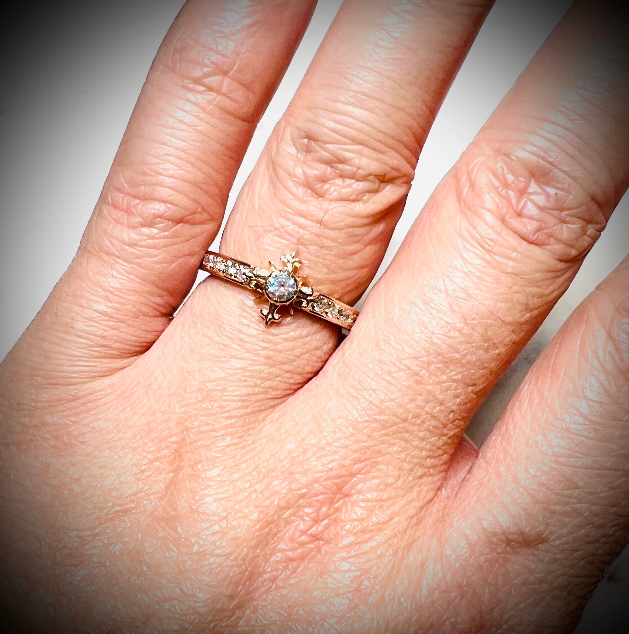 中央の石は、キュービックジルコニアに特殊なオーロラ加工を施してあるので、角度で様々な色に輝きます♫