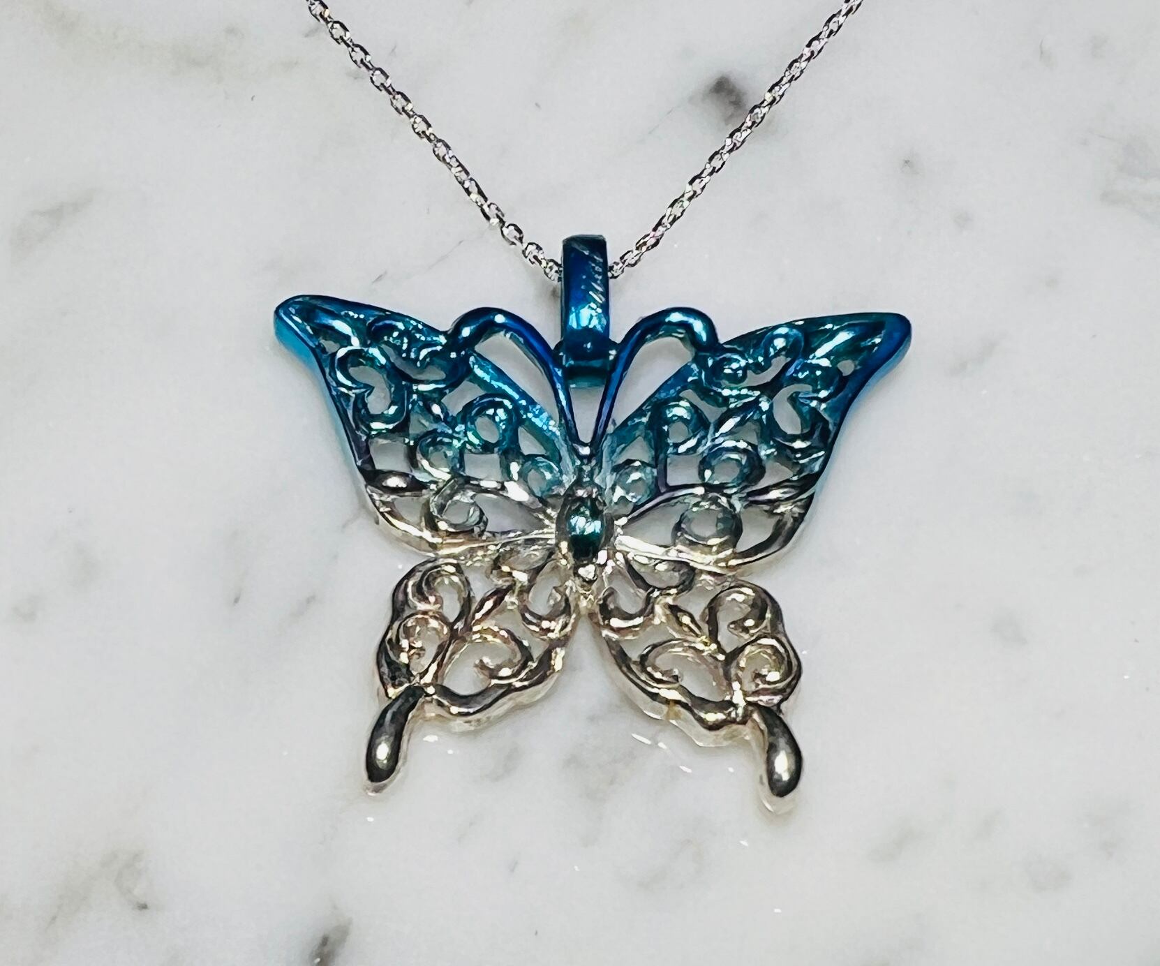細かく透かしに彫られた蝶のデザインペンダントのMサイズを特殊コーティングでグラデーションのBLUEカラーに仕上げた物です☆