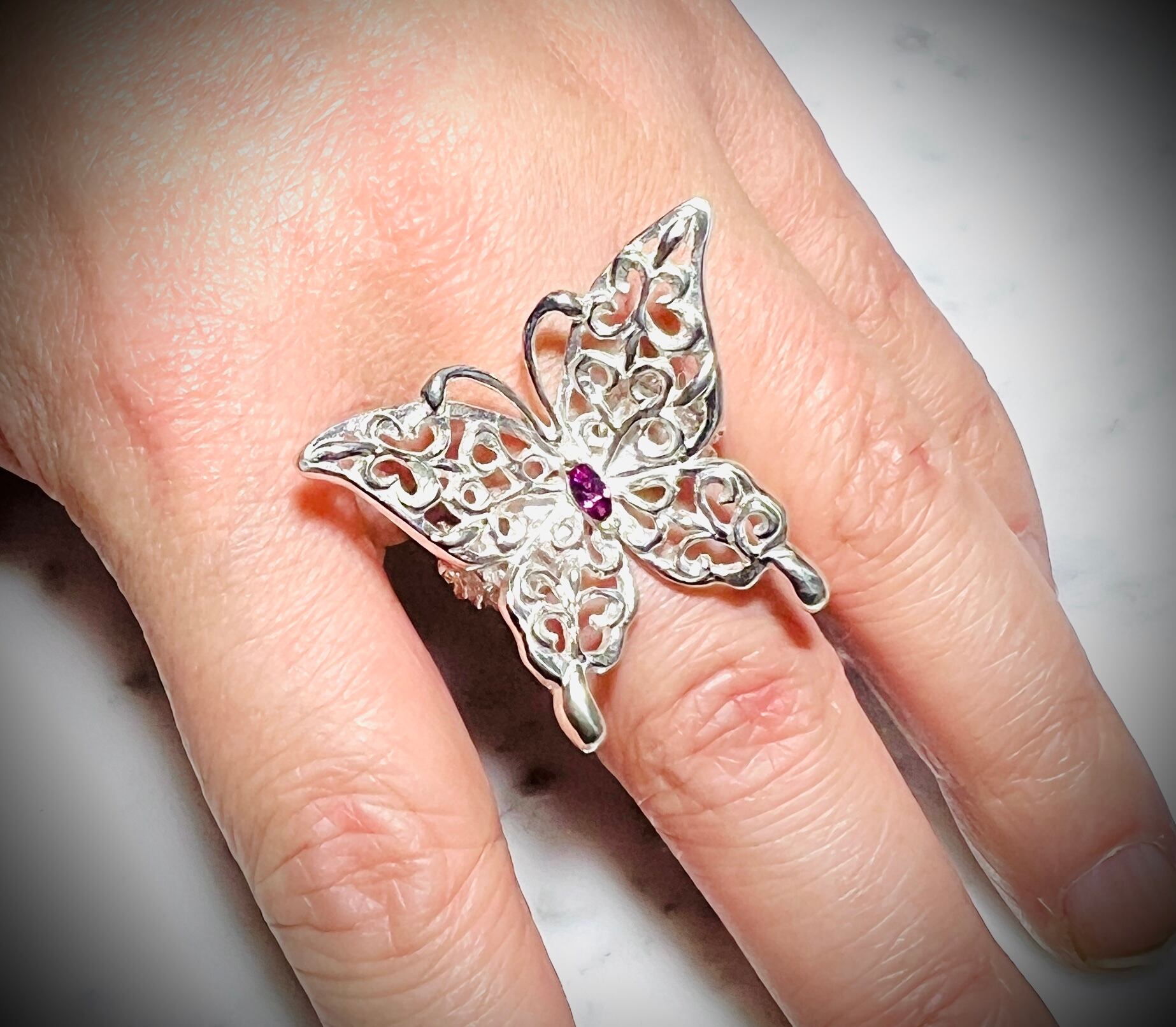 透かし彫りで表現された指にとまる蝶々のリングです☆