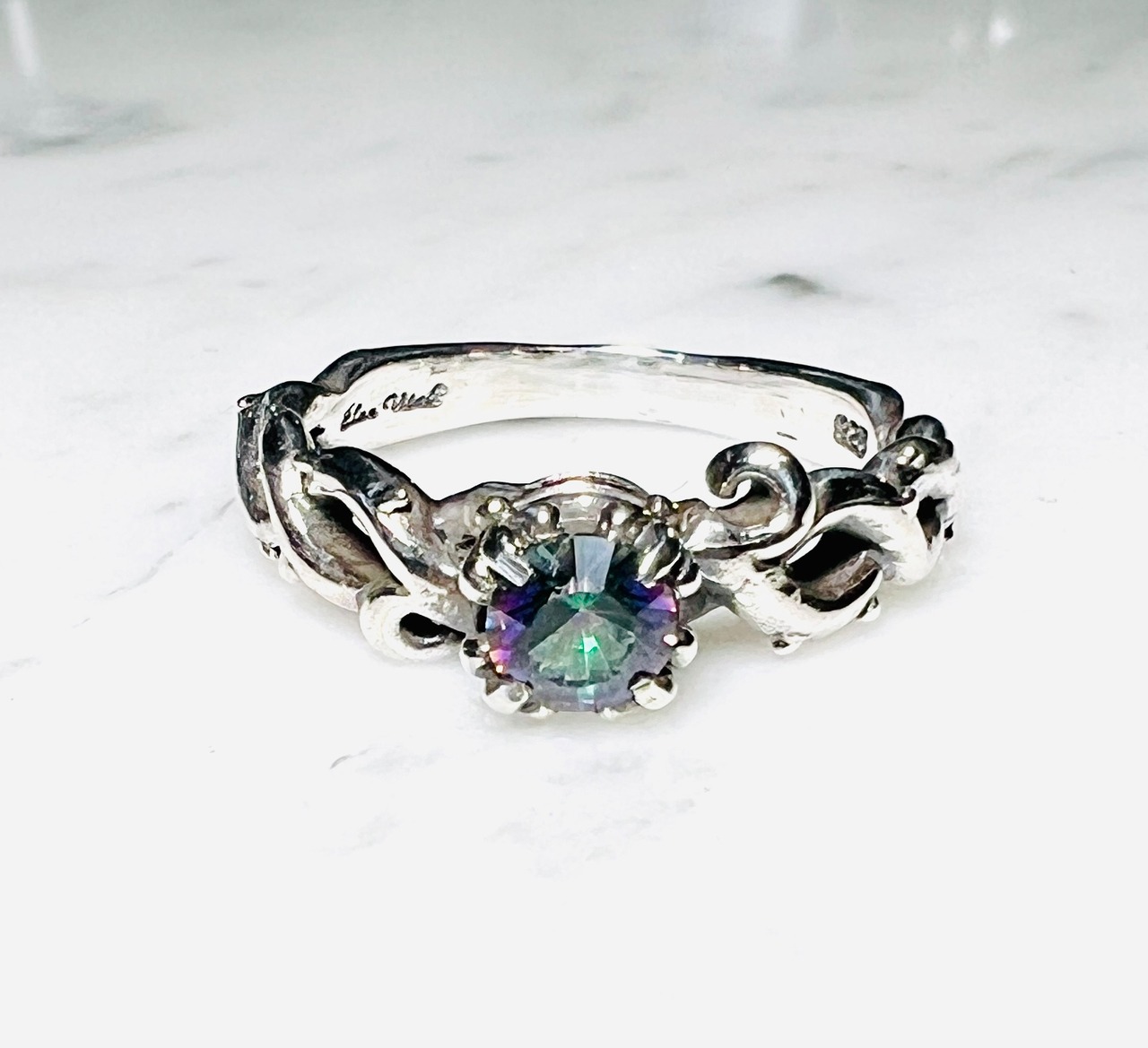 怪しく輝くミスティッククォーツ(水晶に特殊なコーティングを施した石)で17号の燻し有り