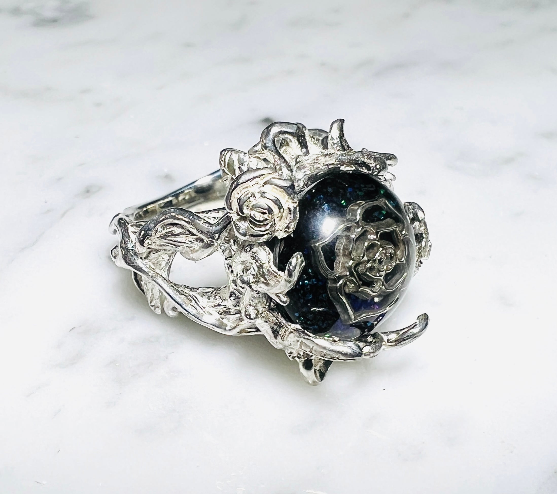 今回は初めての試みで、レジンの中に透かし彫りのシルバーの薔薇の花を配置して、その周りは青や緑のラメを散りばめて、角度によってキラキラと輝かせました☆