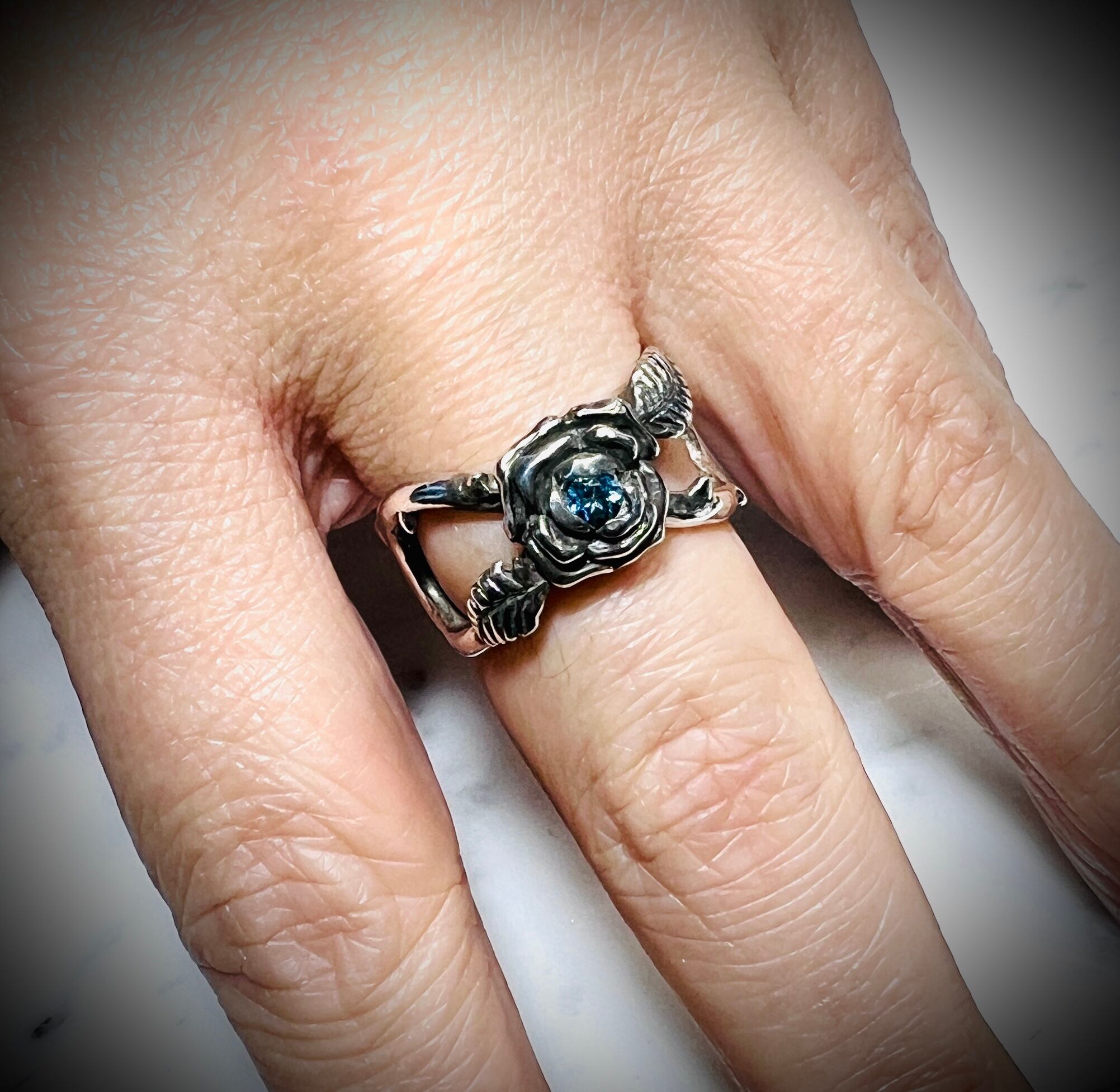 今回はKIYOの気まぐれで、青く綺麗なロンドンブルートパーズを薔薇の中央にセットしました٩( ᐛ )و