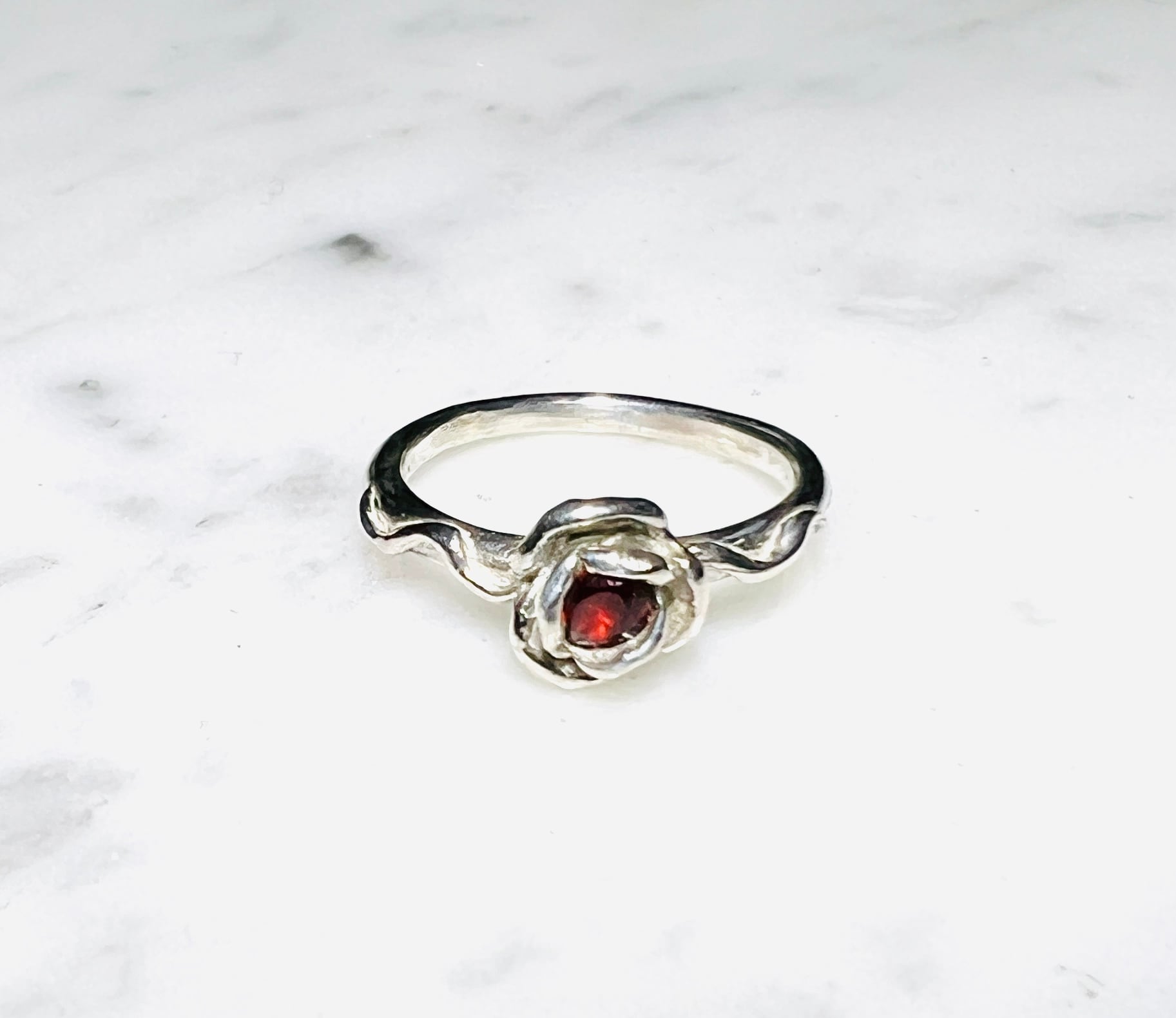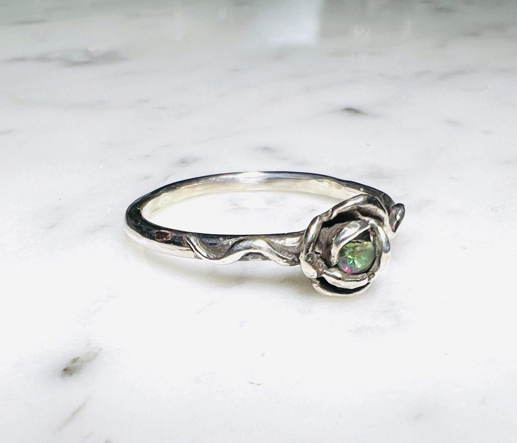 中央に薔薇の花モチーフをサイドにちょろっとツタをデザインした、着けやすい細身のシルバーリングです^_^