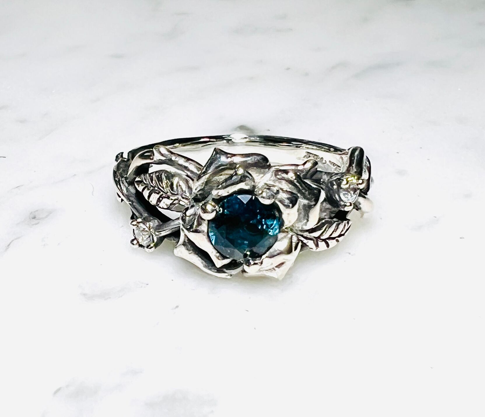 そして、細身ながらもメインの薔薇に大振りな天然石を入れ、無造作に生えるツタの2ヶ所にクリアのジルコニアを入れ輝きを。