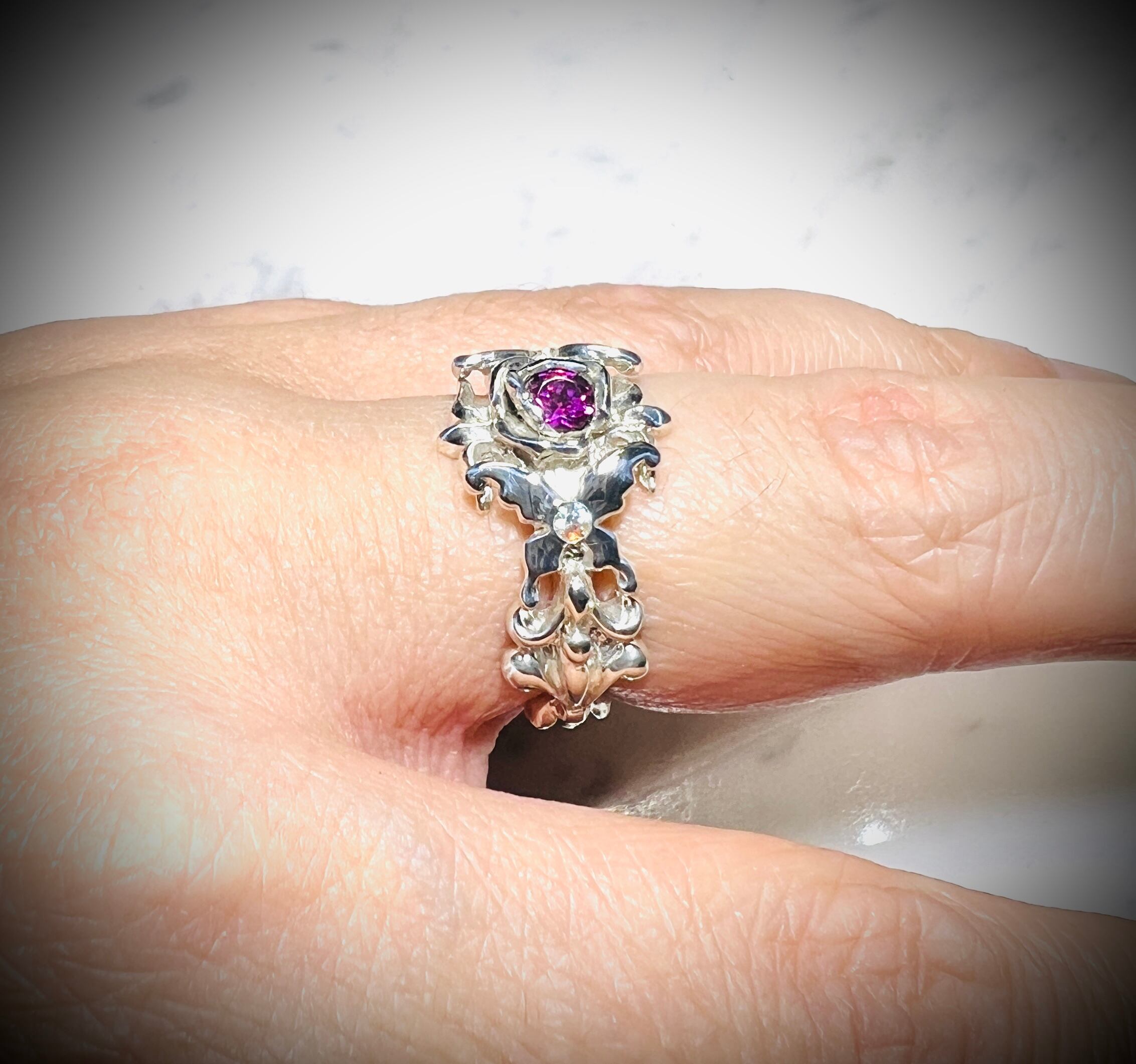 今回は、KIYOの気まぐれで、薔薇にロードライトガーネットをセットして、サイドの蝶に虹色オーロラ加工のジルコニアをセットして、白仕上げ13号でご用意☆