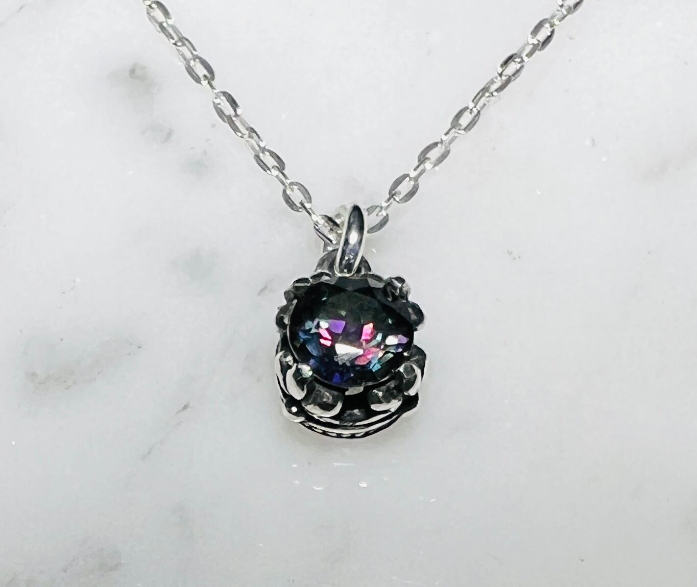 右、角度によって紫、緑、青が混ざり合う暗い宇宙の様なホワイトトパーズを特殊加工した石。