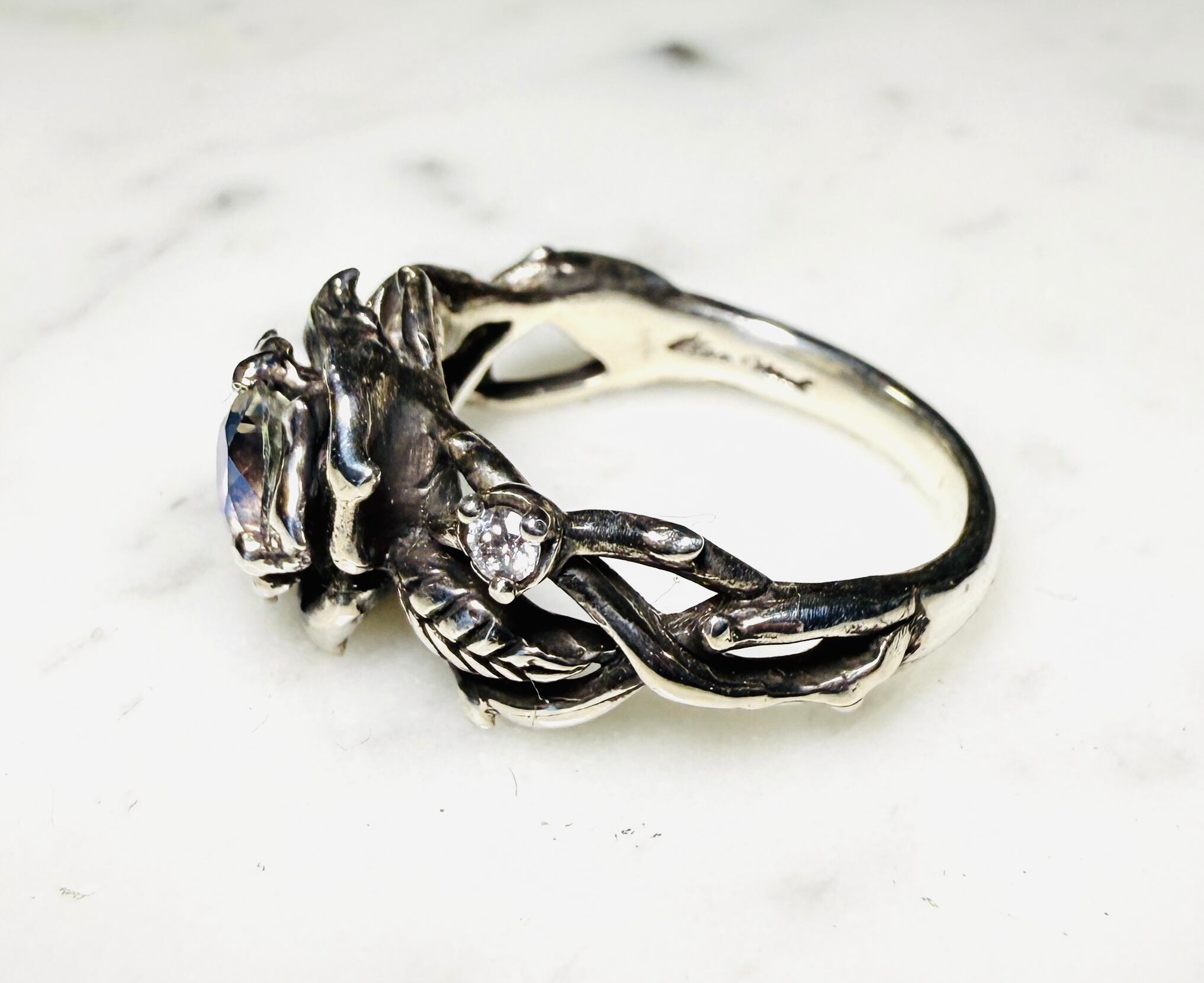 そして、細身ながらもメインの薔薇に大振りな天然石を入れ、無造作に生えるツタの2ヶ所にクリアのジルコニアを入れ輝きを。