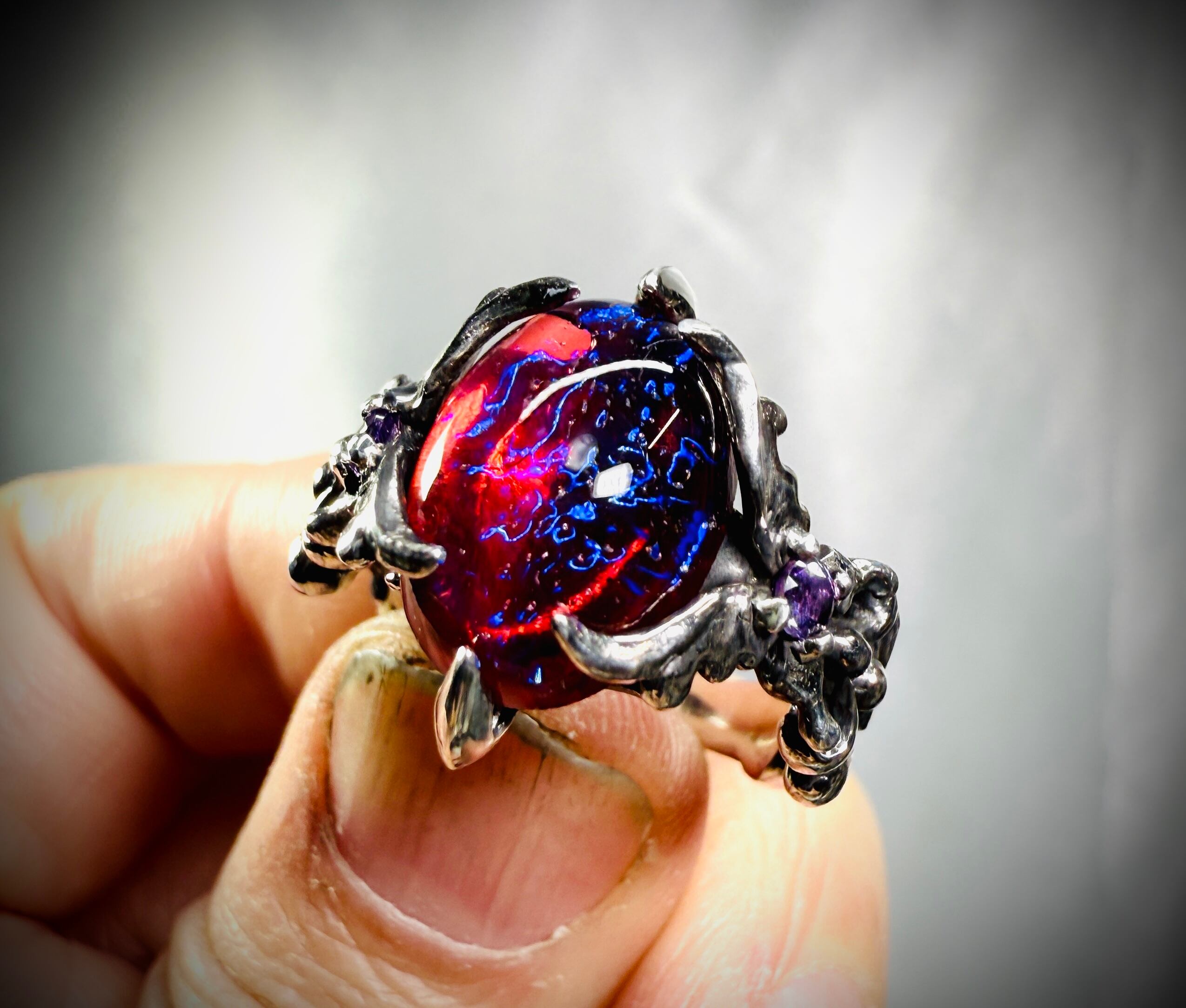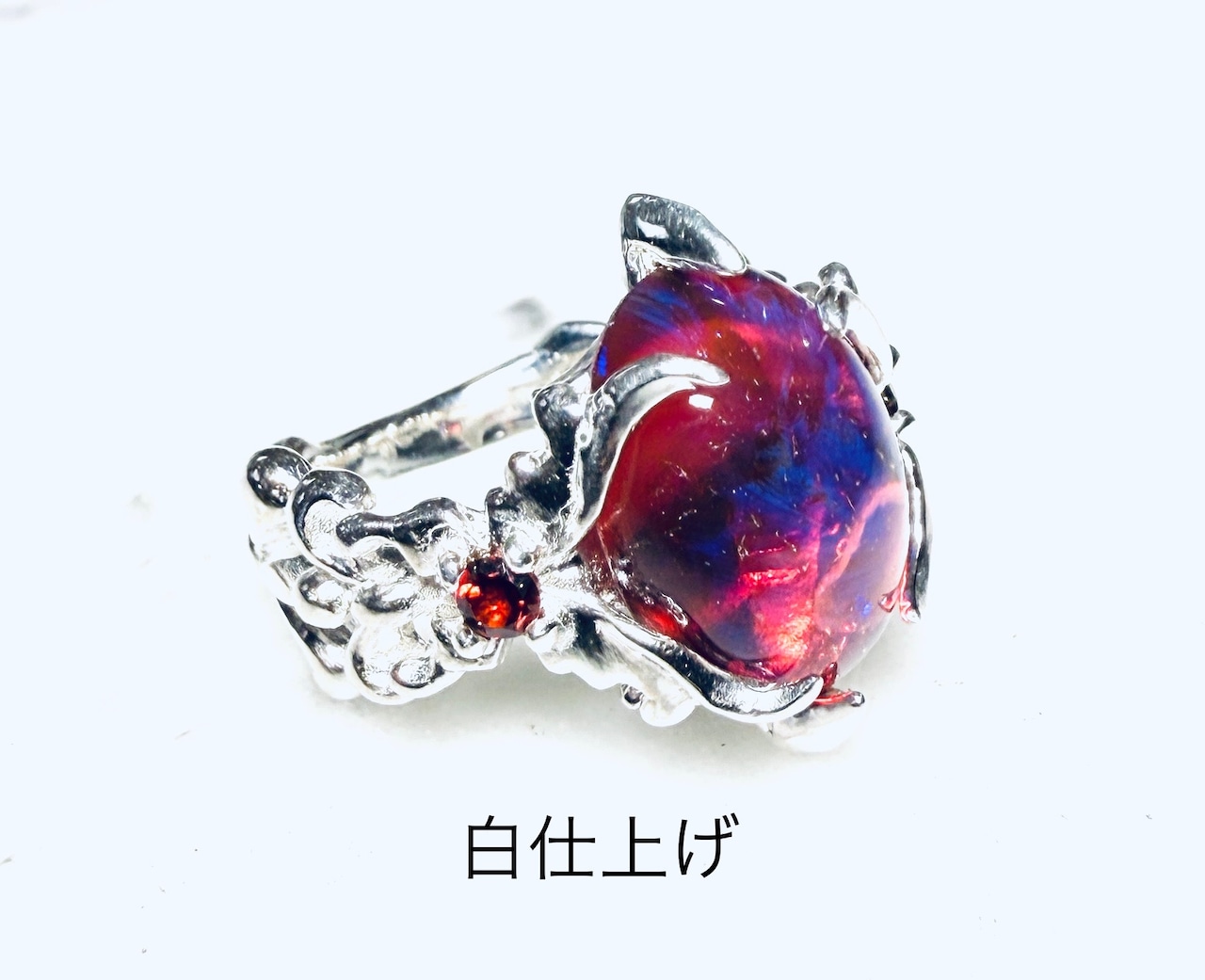 左右から燃え上がる様な蝶のデザインで石を固定しました