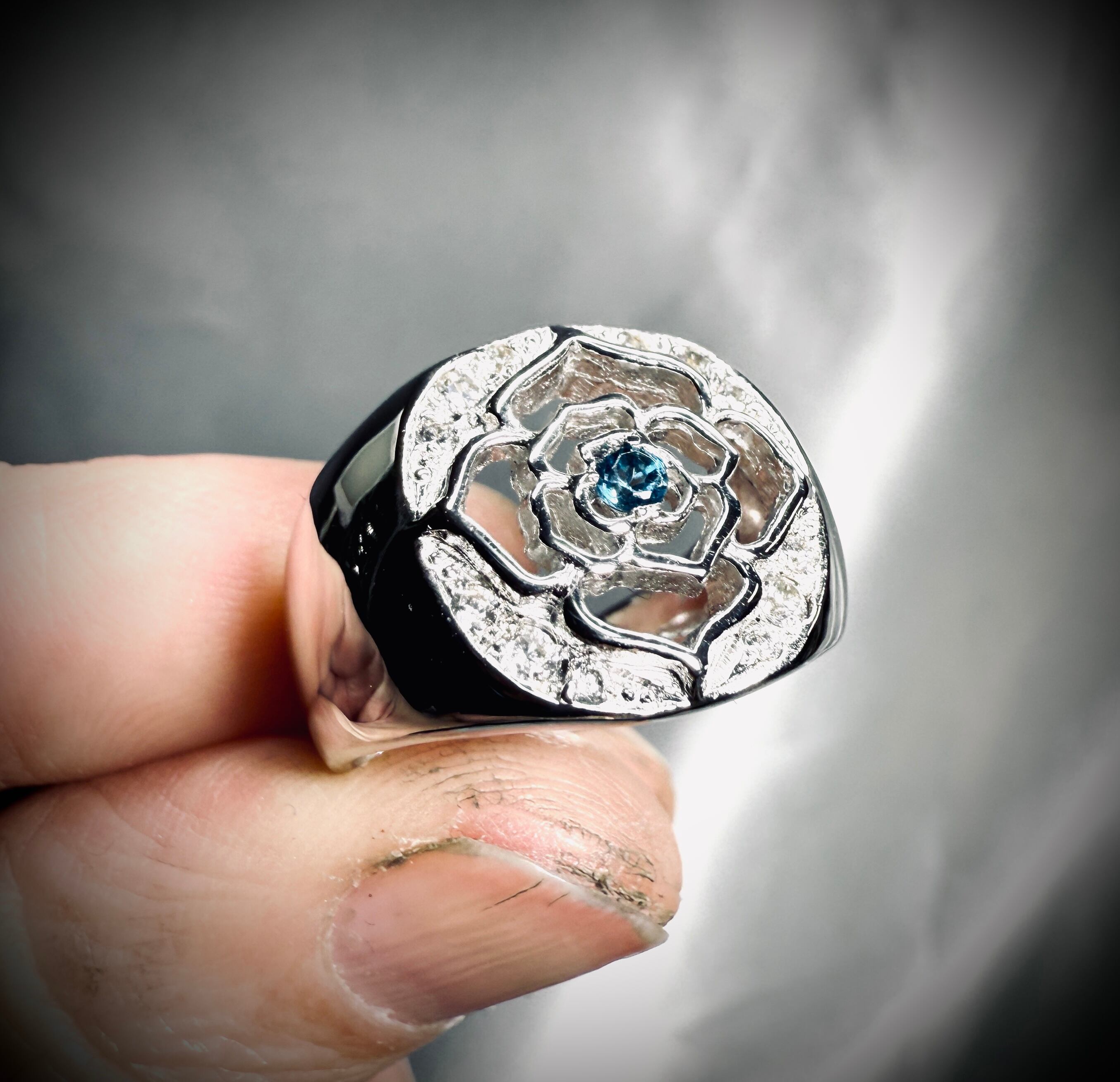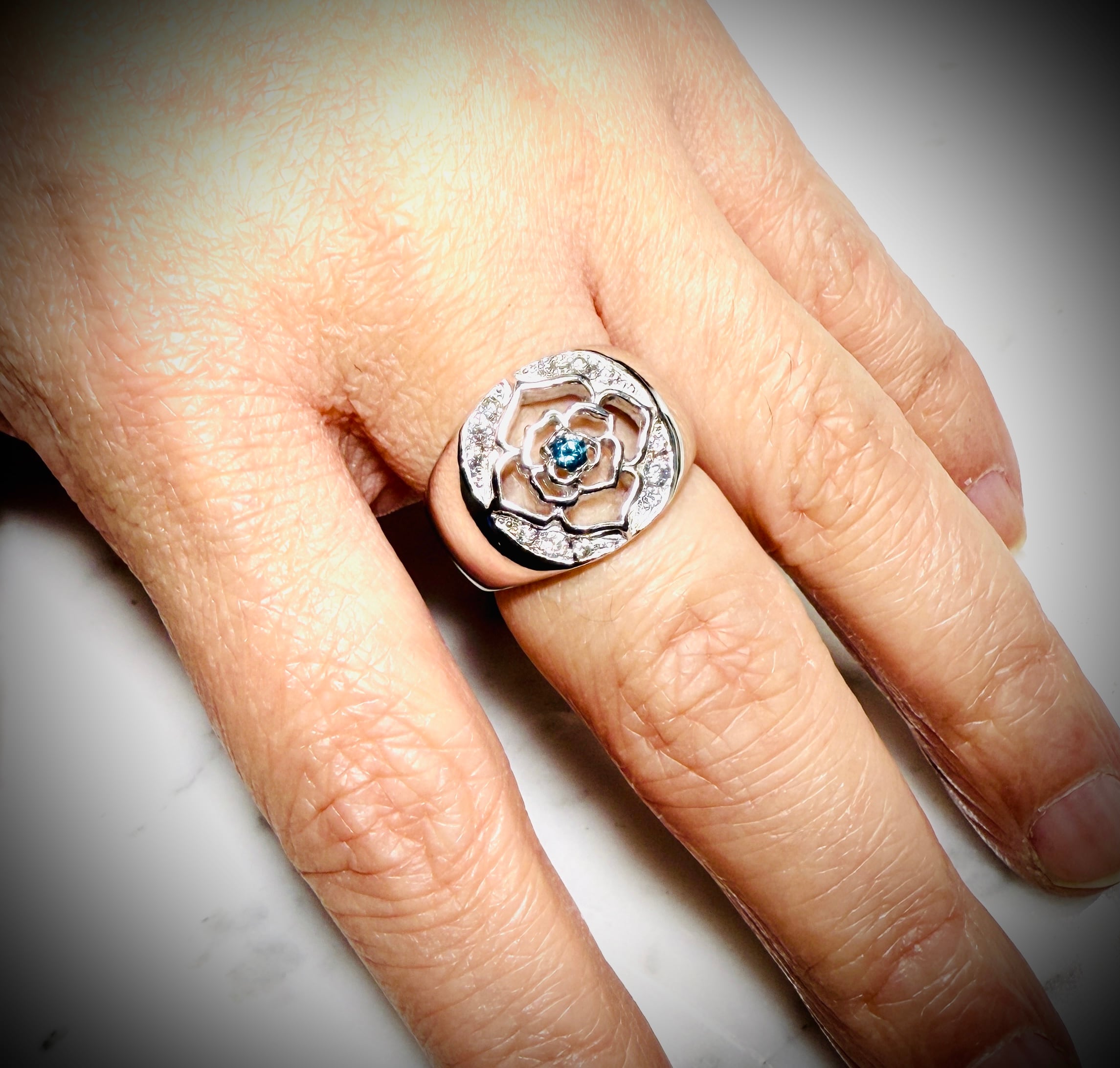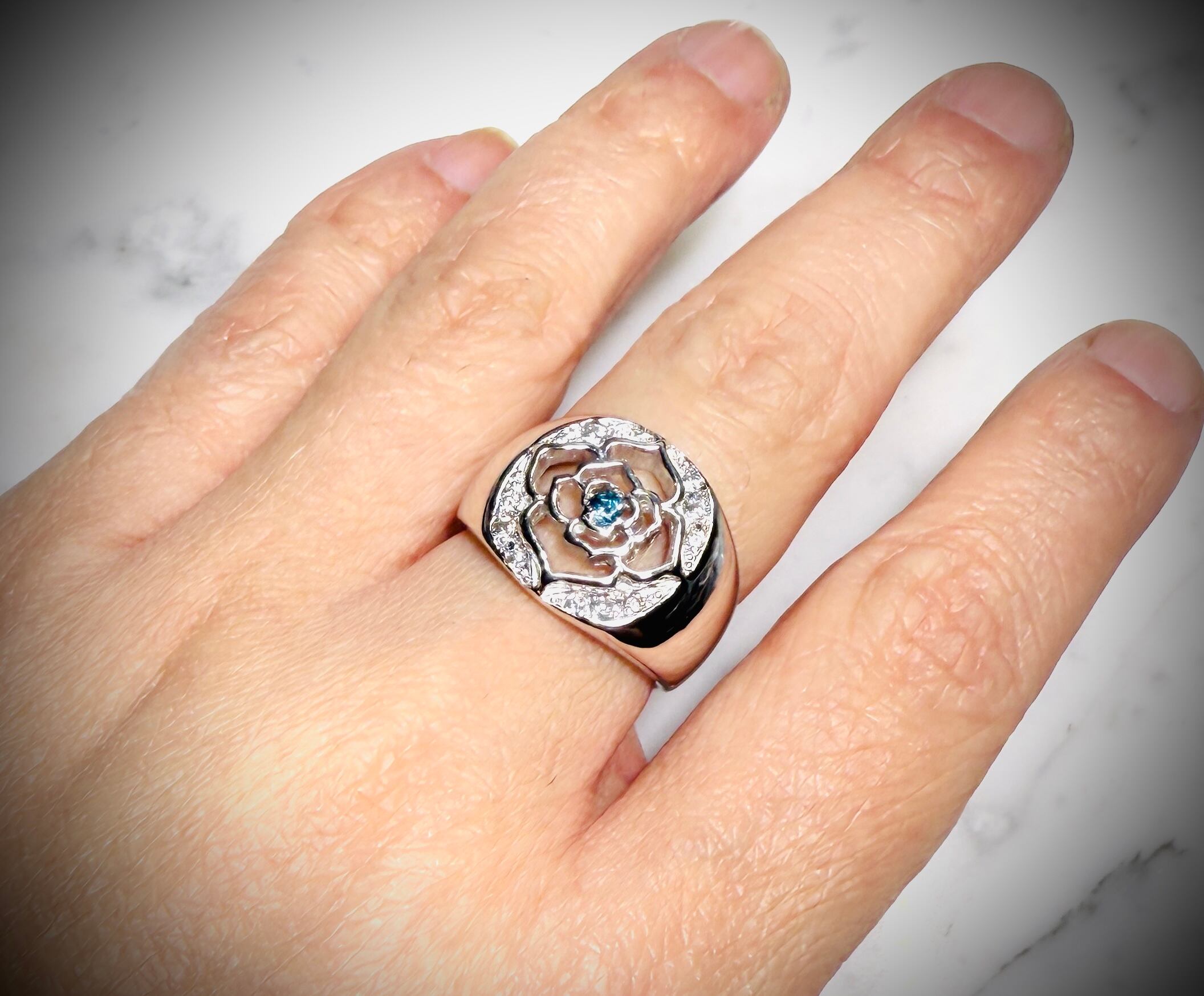 薔薇の中央には、青が綺麗なロンドンブルートパーズを。